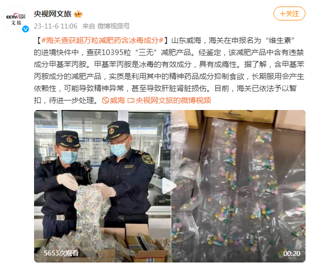 山东威海,海关在申报名为“维生素”的进境快件中,查获10395粒“三无”减肥产品。经鉴定,该减肥产品中含有违禁成分甲基苯丙胺。甲基苯丙胺是冰毒的有效成分,具有成瘾性。据了解,含甲基苯丙胺成分的减肥产品,实质是利用其中的精神药品成分抑制食欲,长期服用会产生依赖性,可能导致精神异常,甚至导致肝脏肾脏损伤。目前,海关已依法予以暂扣,待进一步处理。