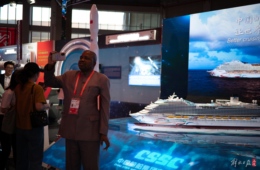 中国馆中可以见到不少上海元素。爱达•魔都号从上海启航,代表的是中国在游轮制造领域已经达到世界尖端水平。为这艘巨船制作的实景模型吸引了中外来宾打卡拍照。