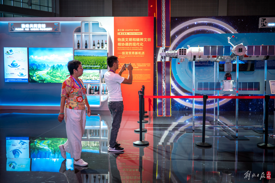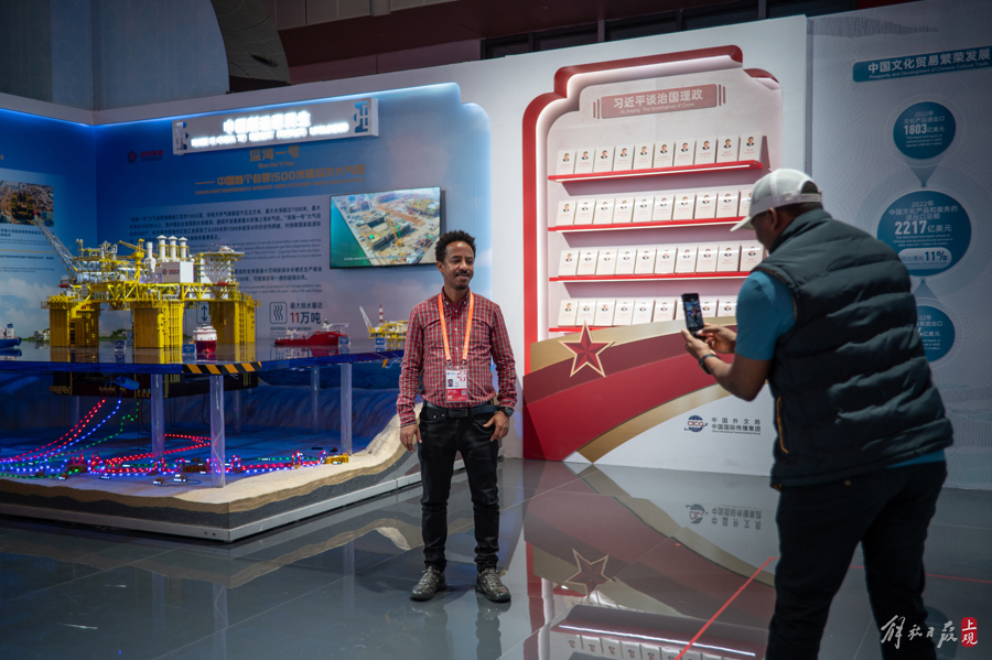 来自海外的媒体、参访团体来到中国国家馆,被丰富的内容深深吸引,流连拍照。
