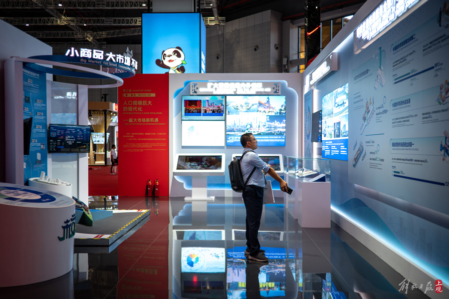 第六届进博会,中国国家馆全新升级,仅面积就扩大至2500平方米。今年中国馆以“中国式现代化新成就为世界提供新机遇”为主题,视觉上则以红色为主基调,鲜艳明快。展区内分为五大板块,重点展示了我国在贸易投资、创新智造等多领域的成果,体现出我国推进高水平开放和高质量发展的努力。