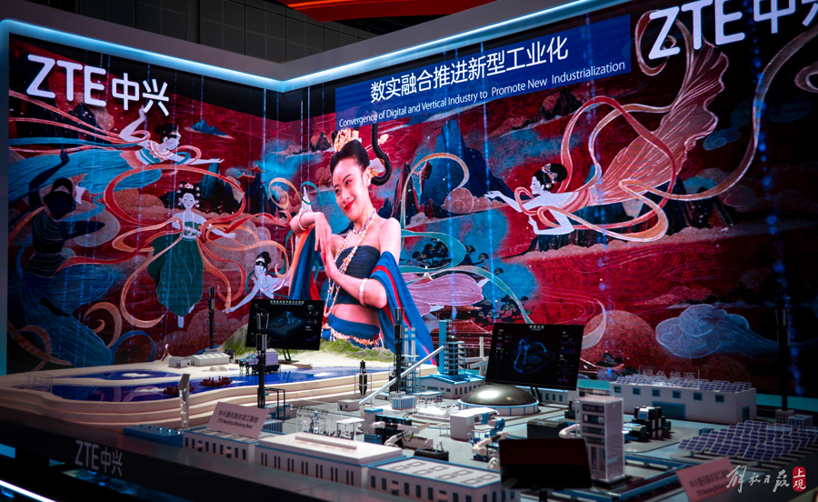 中兴科技在国家馆中展示了通过数字和实景融合,推进新型工业化的成果,并以工厂园区的实景模型为媒介,进行生动展示。