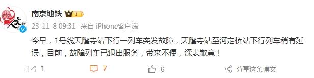 今早,南京地铁1号线天隆寺站下行一列车突发故障