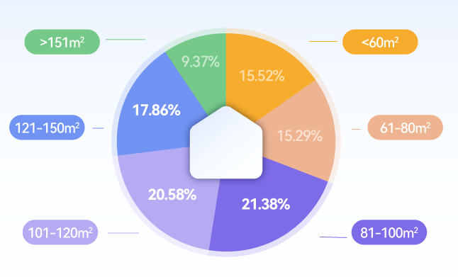 数据显示,今年前三季度,平台装修用户的户型面积最多的集中在81-100平米,这一面积区间的占比达到21.38%。其次便是101-120平米、121-150平米的改善型,占比分别为20.58%和17.86%。当然,80平米以下的“小户型”甚至“微小户型”,超30%的总量占比也不容小觑,而151平米以上的“特大户型”占比还不到十分之一。