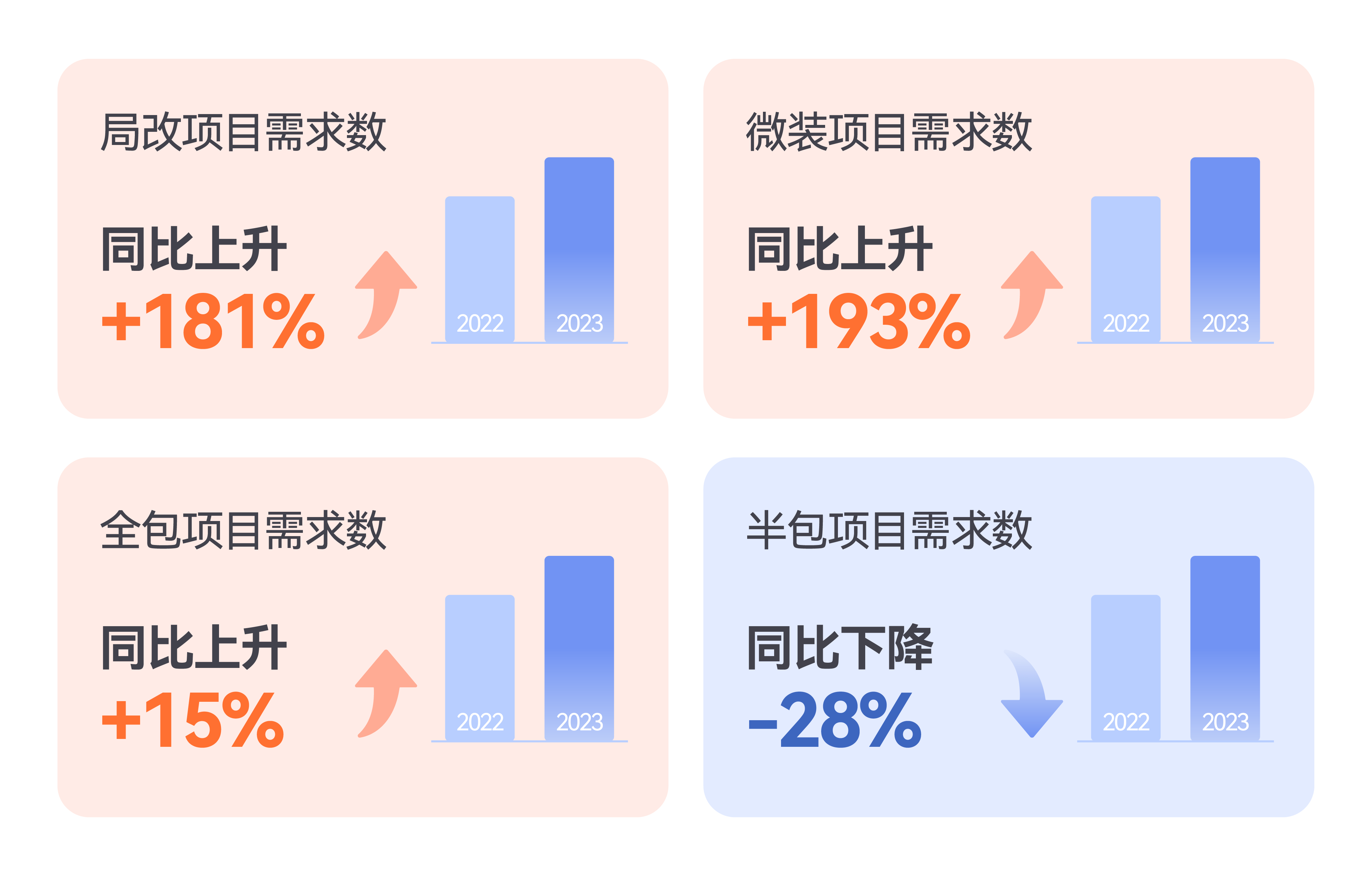 今年平台项目需求数的“全包项目”增长明显,居民更愿意在装修时选择“包工包料”这种更为省心省时的模式。相比之下,在全包同比上升15%的同时,“包工不包料”的半包模式正出现大幅下滑,同比2022年降低28%。