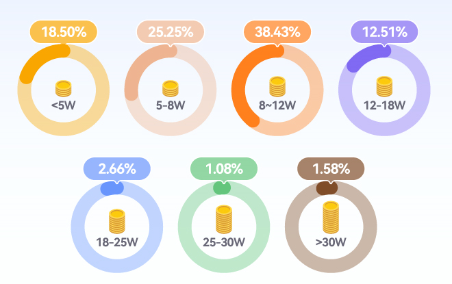 在装修中,与户型面积挂钩最为密切的当属预算,两者一直都是正向关联。2023年以来,8至18万元成为装修用户的最优预算,平台上过半用户的基础装修预算都集中在这一区间。而为基础装修预算5到8万元的占比也较为集中,占到用户总数的四分之一。