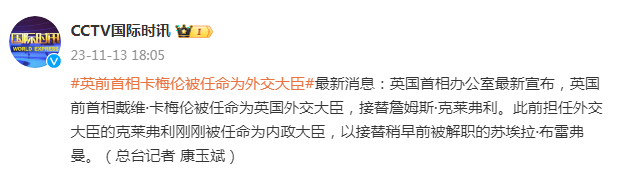 最新消息:英国首相办公室最新宣布,英国前首相戴维·卡梅伦被任命为英国外交大臣,接替詹姆斯·克莱弗利。此前担任外交大臣的克莱弗利刚刚被任命为内政大臣,以接替稍早前被解职的苏埃拉·布雷弗曼。(总台记者 康玉斌)