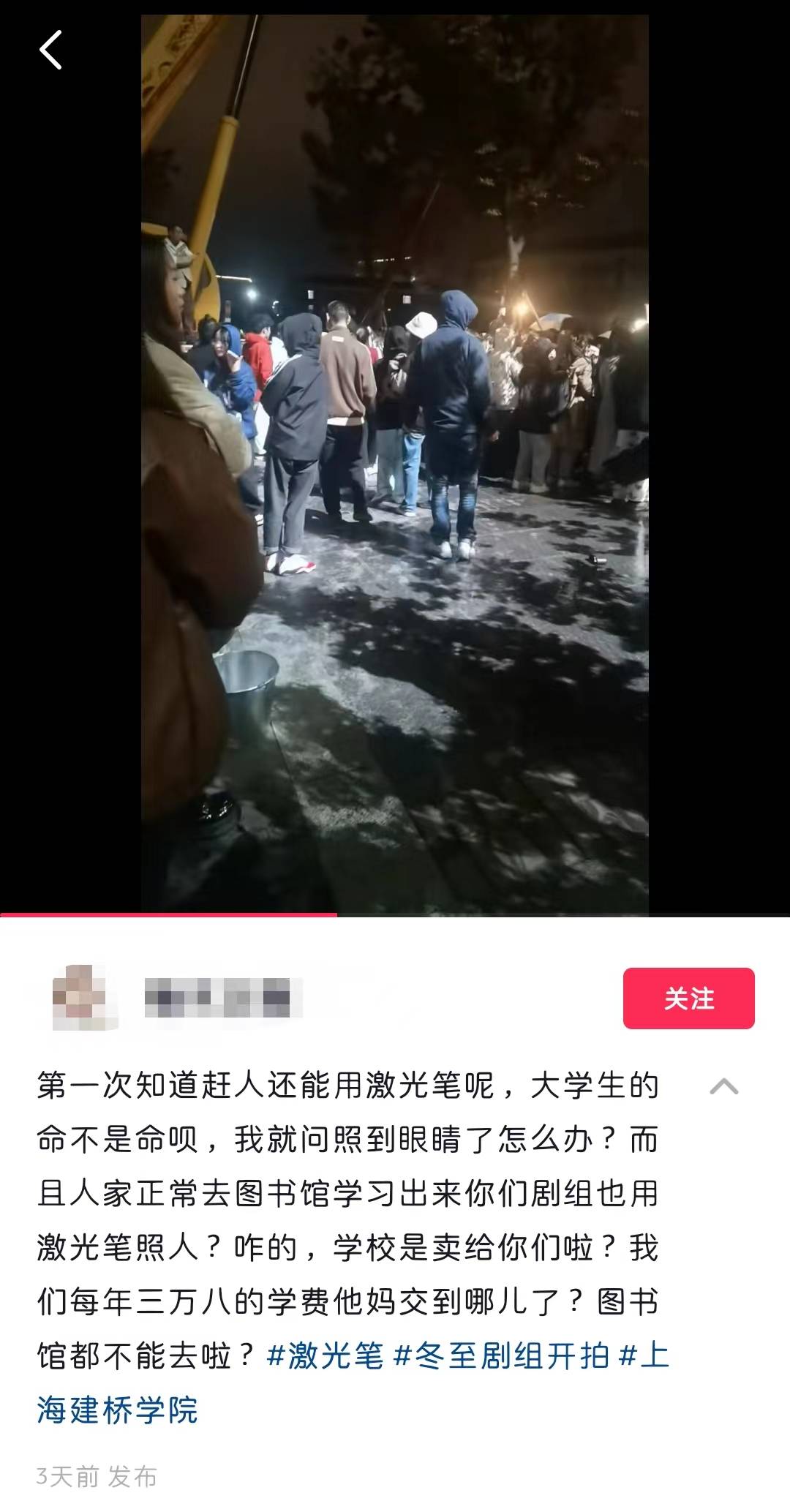 发布视频的这位网友对此表示了不满,“第一次知道赶人还能用激光笔呢,我就问照到了眼睛怎么办?而且人家正常去图书馆学习你们剧组也用激光笔照人,咋的,学校是卖给你们啦?”该网友透露,相关剧组为网剧《冬至》剧组,始发地在上海建桥学院,12日《冬至》剧组在建桥学院内取景拍摄。有多位网友表示有类似的遭遇,“我昨天从自习室出来往那边才走了两步就被照到了。”“昨天晚上剧组在宿舍楼下搞到凌晨12点多,很多学生这个点已经要睡觉了。”也有网友猜测剧组使用激光笔的原因是防止学生拍照路透,“激光笔照到手机摄像头就废了,估计是防止你们拍照。”