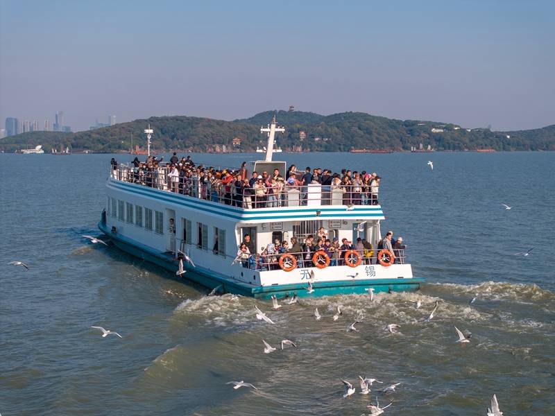 11月15日,红嘴海鸥在鼋头渚太湖水面上翱翔。立冬节气后,红嘴海鸥从遥远的西伯利亚迁徙到无锡过冬,为初冬的太湖增添了几分灵动。