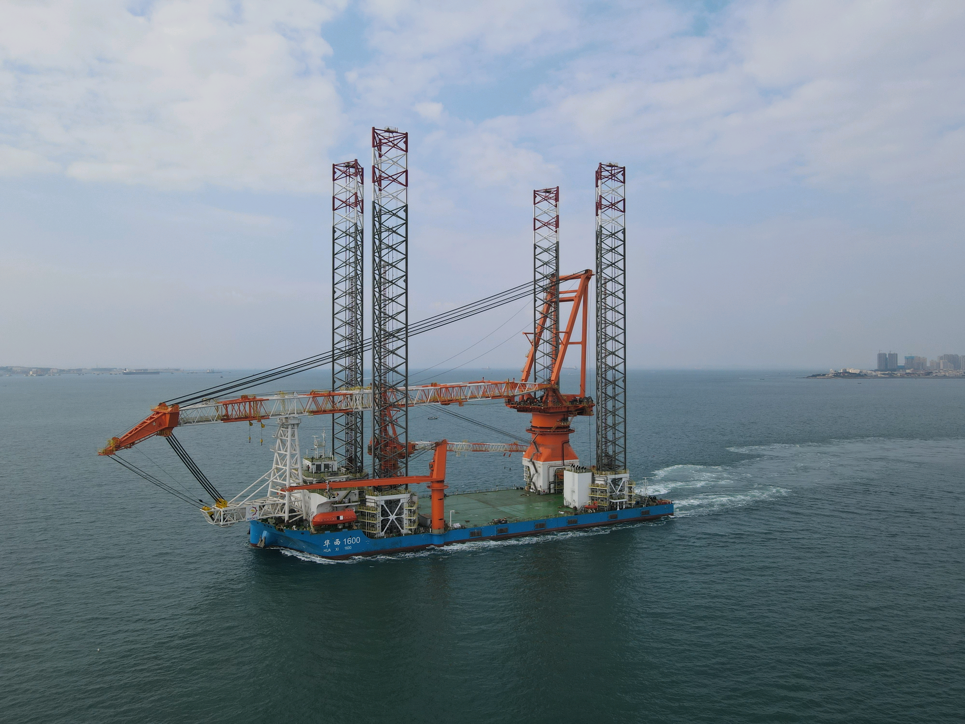 这艘1600 吨自航自升式风电安装平台(船)采用流线型船艏、方型船艉设计,全钢质焊接结构,配备四桁架桩腿、齿轮齿条式升降系统,桩腿高 125.85 米,最大作业水深70米。平台型长136米,型宽50米,型深10米,可变载荷6500吨,续航力3000 海里,主吊机起重能力达 1600 吨,辅起重机起重能力达 250 吨。平台中部开敞作业甲板面积约4500平方米,可装载4套8兆瓦或 2 套 16兆瓦的风机设备及部件出海作业。