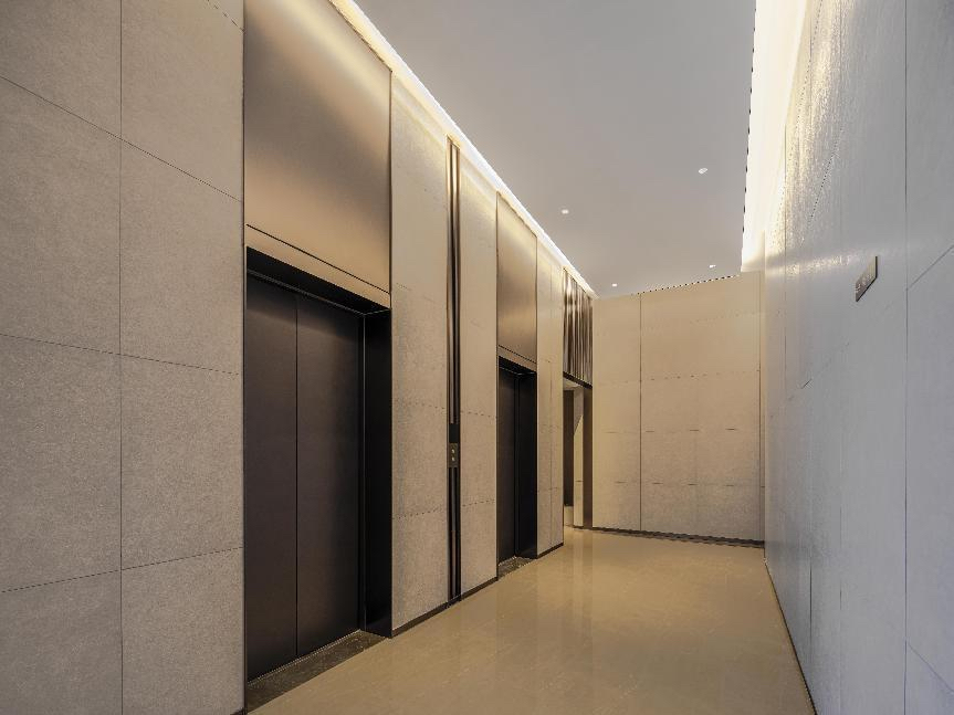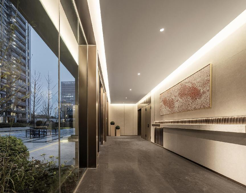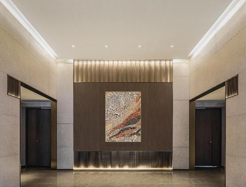 璞境的地库大堂内采取同地面入户大堂一样,以安缦高级度假酒店式的入户大堂装饰风格、配以精心设计的细节打造,金属包边、金属踢脚线,就连强弱电房也做了隐藏处理,加上高雅的壁画等的装饰,给业主一种酒店归家仪式感。