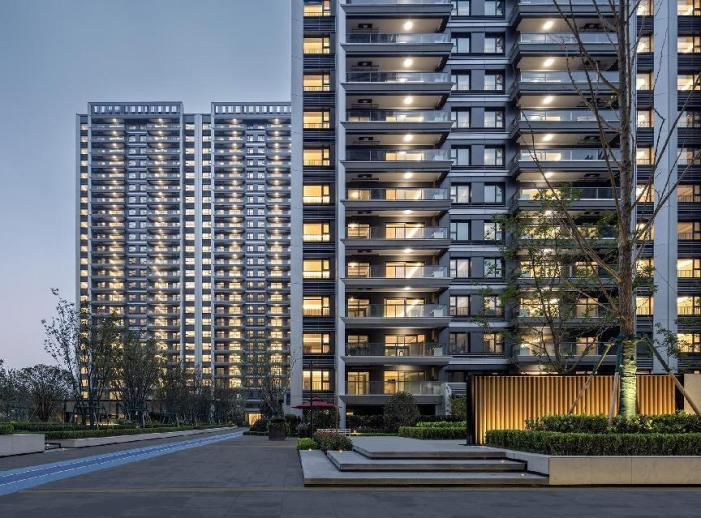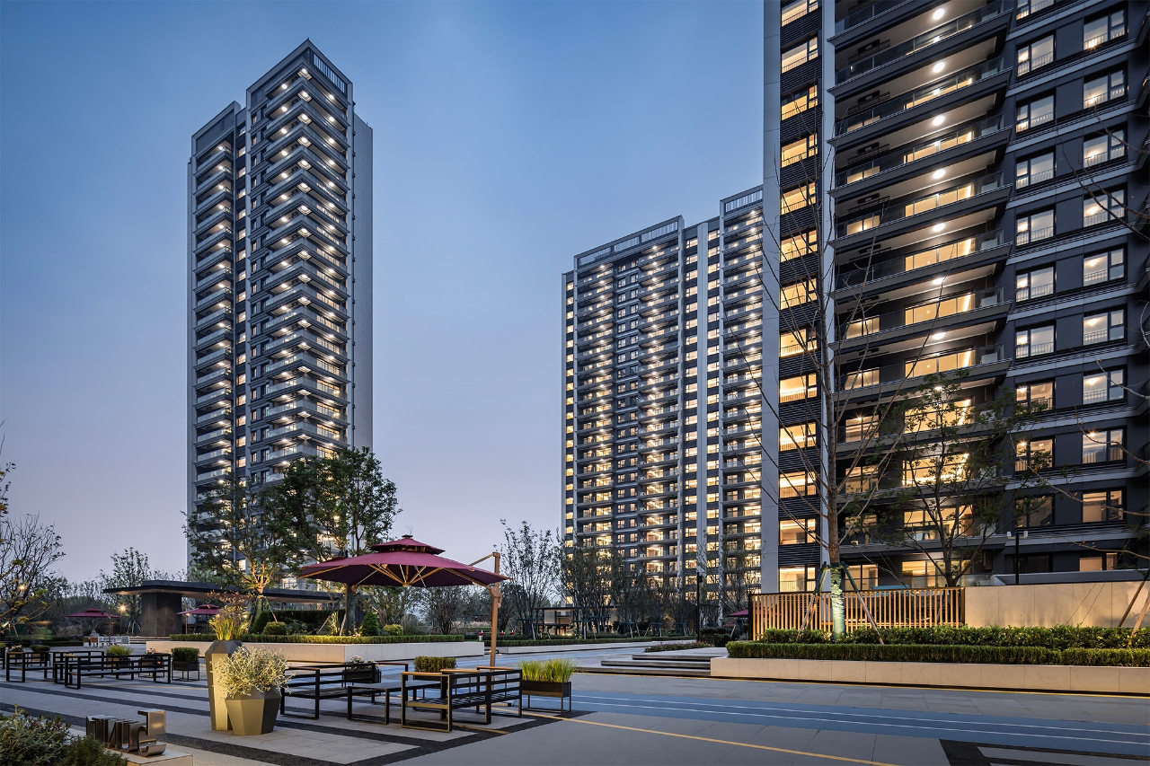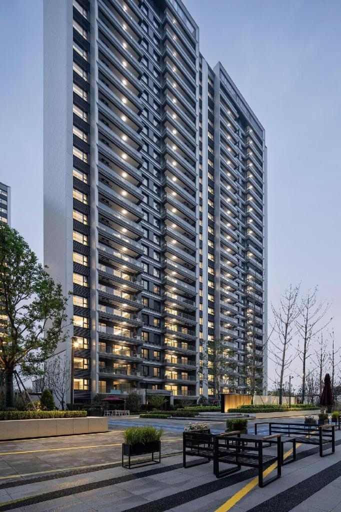 项目外立面灵感源自战斗机进气栅斜切造型,立面运用大量氟碳铝板,斜切角度设计,实现更轻薄的视觉感受,打造约为0.4的高窗墙比(南向立面),超出常规住宅设计,最大限度地满足采光需求,保障观景视线。