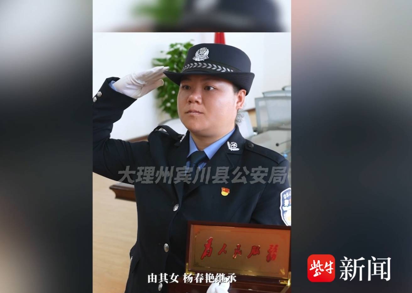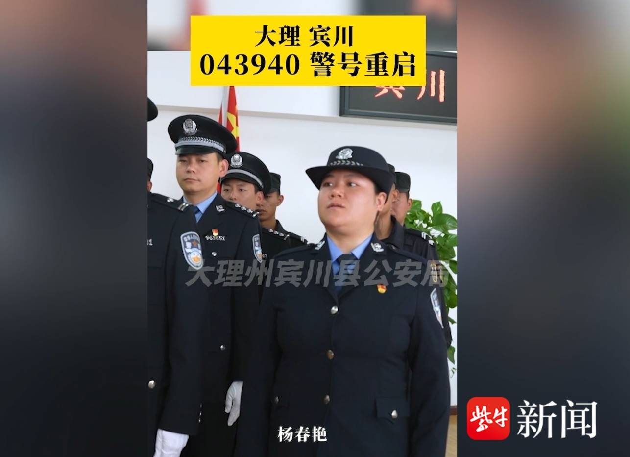 “杨春艳!”“到!”“043940,欢迎归队!”近日,警号043940重启仪式在云南大理州宾川县公安局举行。新警杨春艳继承了父亲杨金良的警号,从此这枚警号有了新的传承。杨金良生前系大理州宾川县公安局看守所二级警长,2021年4月3日在工作中突发疾病经抢救无效不幸牺牲。同年,公安部追授杨金良“全国公安系统二级英雄模范”荣誉称号,此后,他的警号043940被封存。今年,杨金良的女儿杨春艳选择延续父亲对于公安事业的热爱,成为一名人民警察。 “爸爸,您一直都说既然选择了就要对这份选择负责任。以前,我不能理解,现在,我懂了!在以后的工作中,我会以爸爸为榜样认真地对待每一件事情!父亲把生命献给了他热爱的公安事业,警号的重启,是对我的一份期望。我定会铭记着您曾承诺的铮铮誓言——为人民服务!"杨春艳说道。