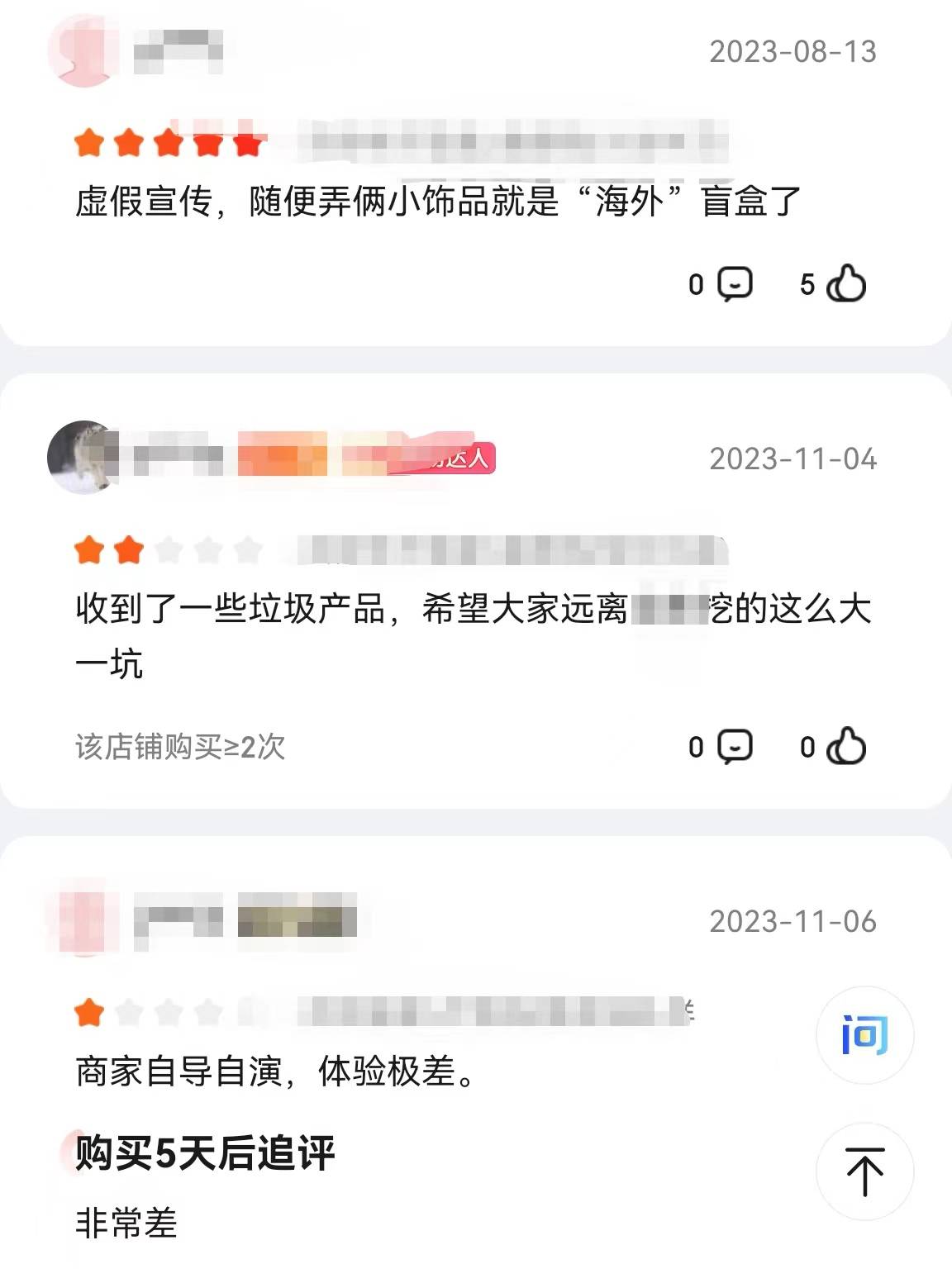 其次,滞留件盲盒套路多,上当容易,捡漏难。商家抓住消费者“以小博大”的心理动歪脑筋,将廉价批发来的小商品分装进不同快递专用盒,通过“精心”包装后,打上“海外原单”的标语,“李鬼”摇身变“李逵”,接下来,在商品评论区安排“低价开出数码产品”等表示“物超所值”“大惊喜”的“买家秀”,进而营造出“买到就是赚到”的假象。殊不知,消费者闭眼买的“滞留件盲盒”,是销售者睁着眼打包的“套路礼盒”,消费者拆开盲盒有惊无喜,不仅没“捡漏”反而“上当”。