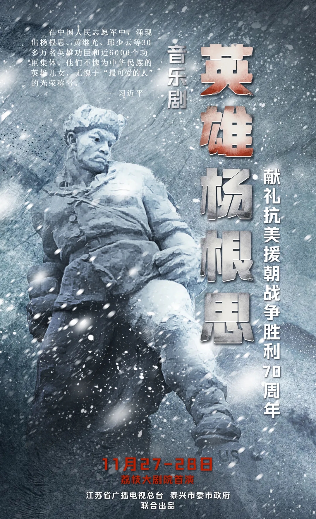 2023年11月27日,由江苏省广播电视总台联合中共泰兴市委、泰兴市人民政府出品的音乐舞台剧《英雄杨根思》,在江苏广电荔枝大剧院首演。