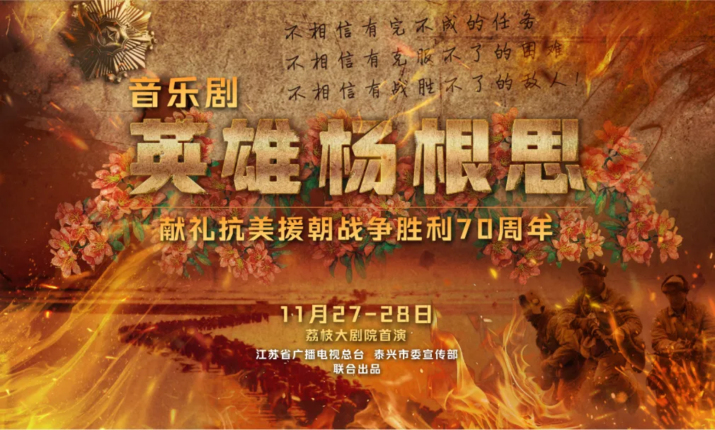杨根思是新中国第一位特等功臣和特级战斗英雄。不相信有完不成的任务,不相信有克服不了的困难,不相信有战胜不了的敌人——他这铿锵有力的“三个不相信”,鼓舞了战场上无数志愿军将士。今年是抗美援朝胜利70周年,为进一步弘扬杨根思“三个不相信”英雄宣言,更好汇聚推进中华民族伟大复兴的磅礴力量,江苏广电总台积极履行主流媒体的责任,深挖江苏红色资源,统筹抓好精品内容生产,联合杨根思故乡泰兴市委市政府创作推出音乐舞台剧《英雄杨根思》,更好激励江苏广大干部群众以当表率、做示范、走在前的果敢担当,在奋力推进中国式现代化江苏新实践中展现新气象、新作为。