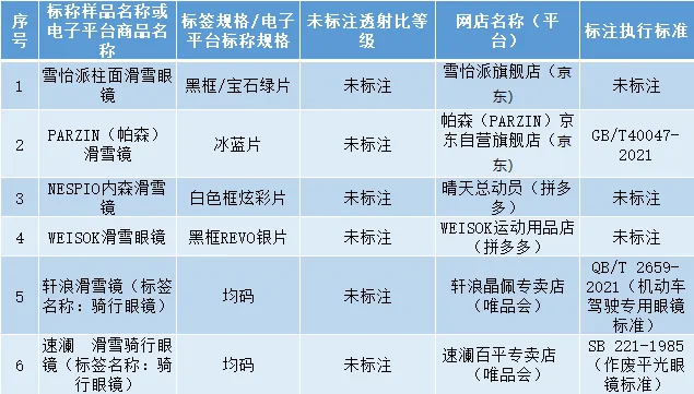 但在标志标签方面,有的在标签或者电商平台标题及网页上均宣称为滑雪镜,使用的却是太阳镜标准,标注驾驶镜标准。