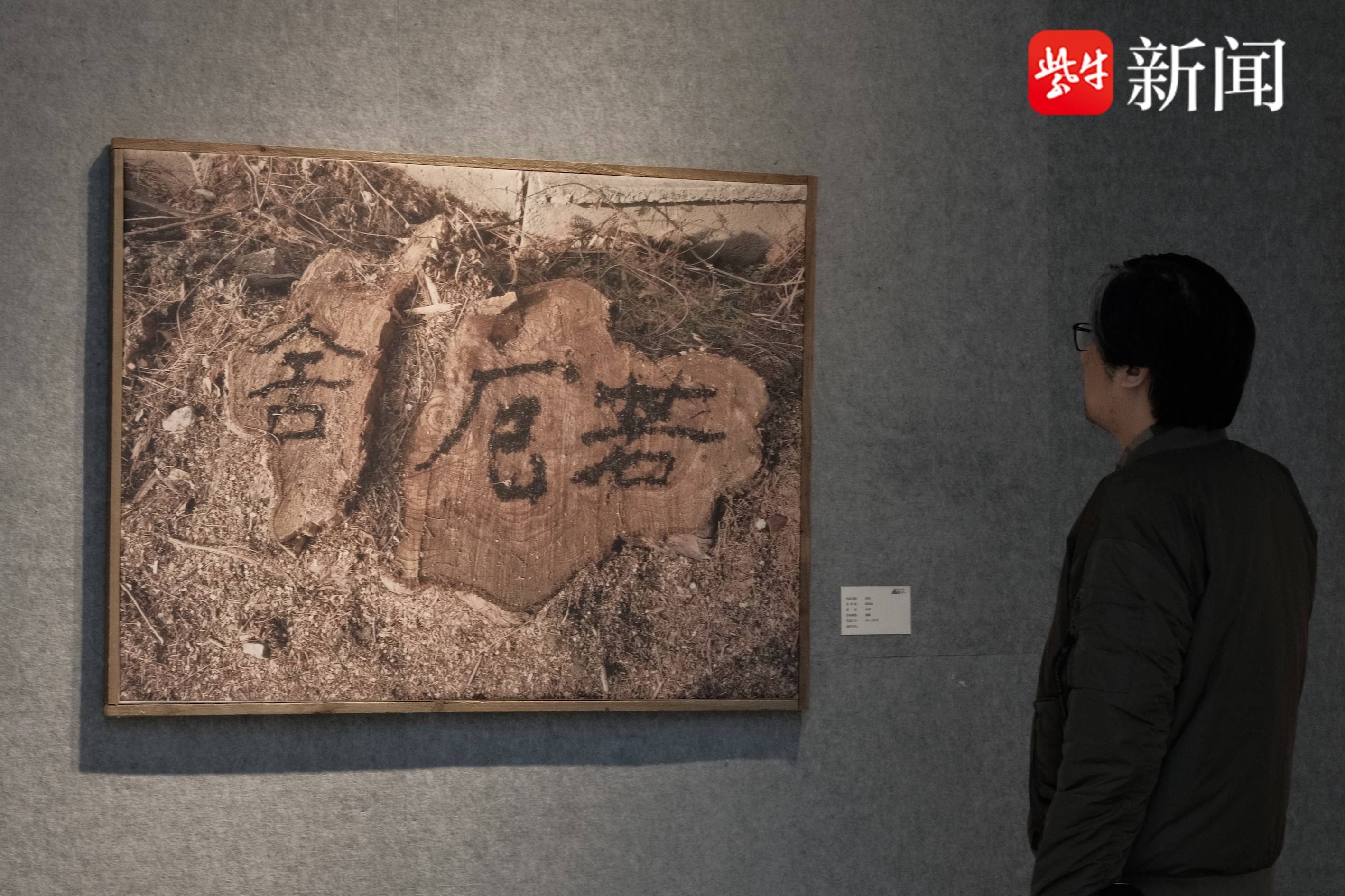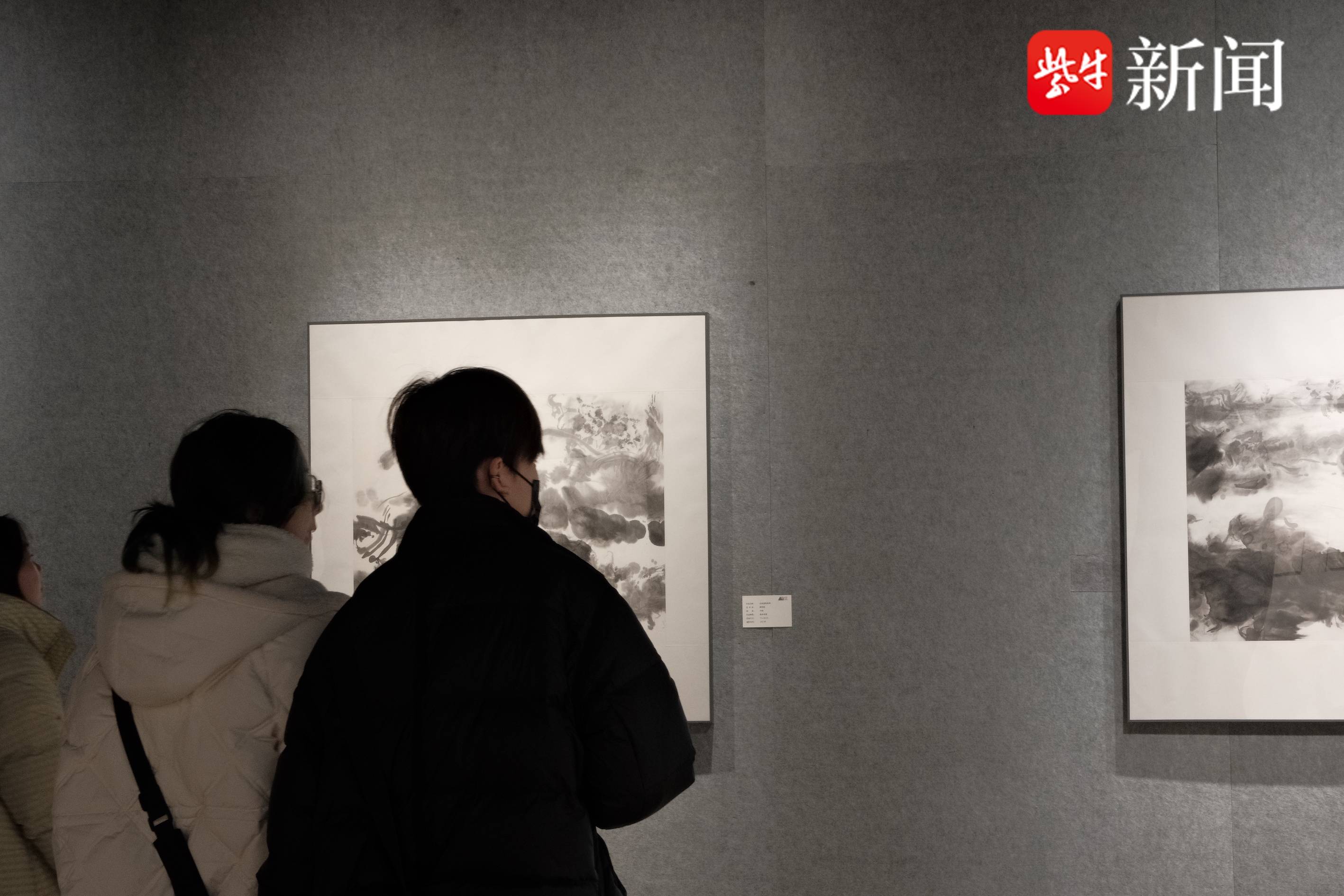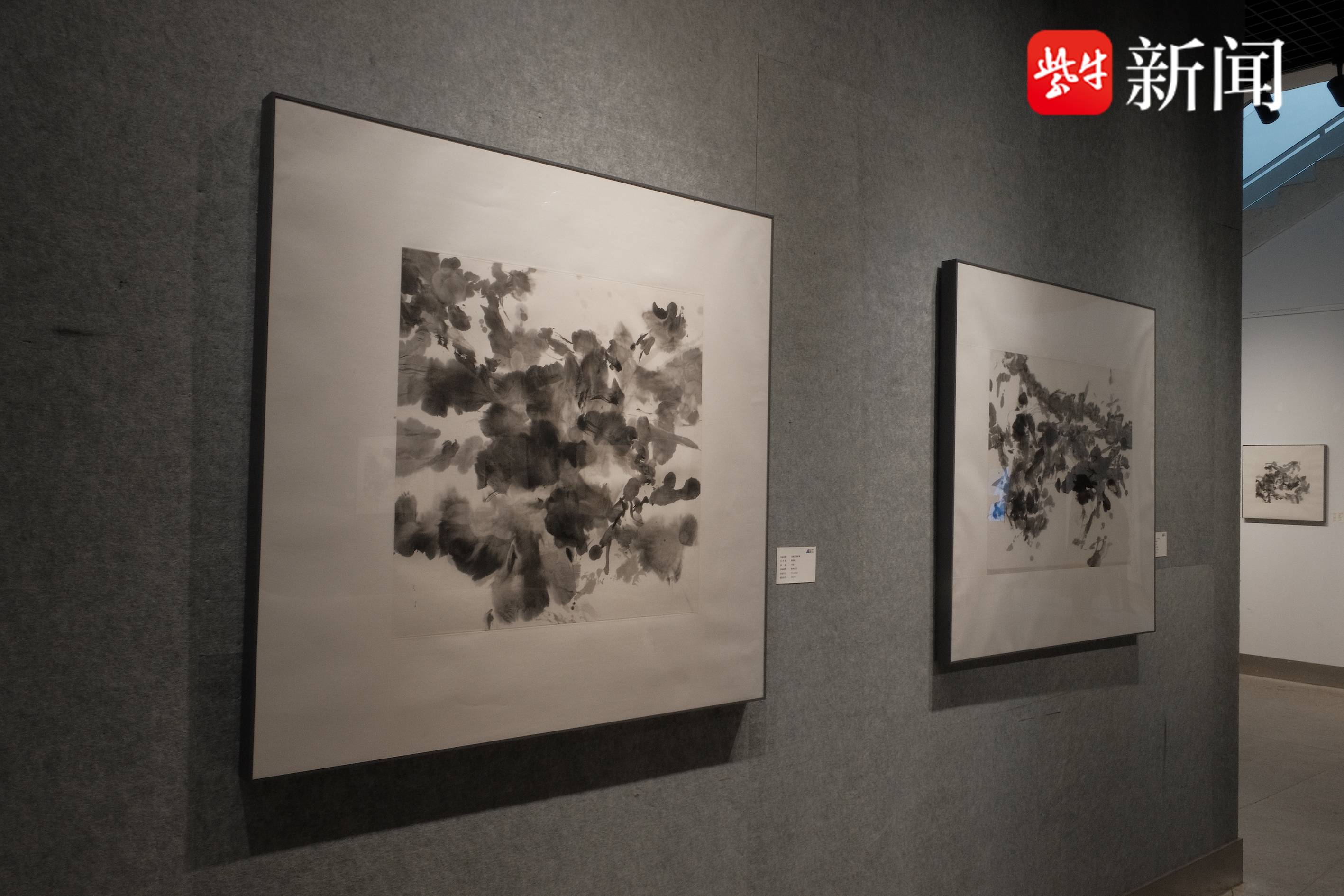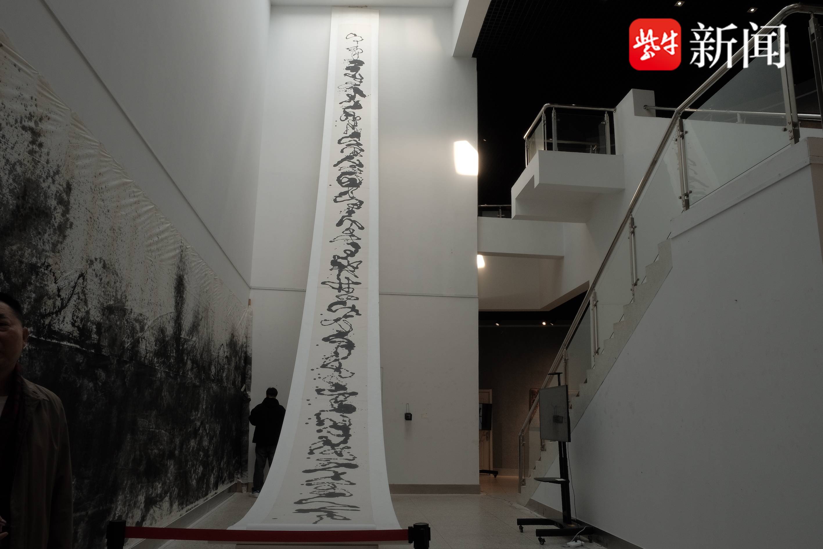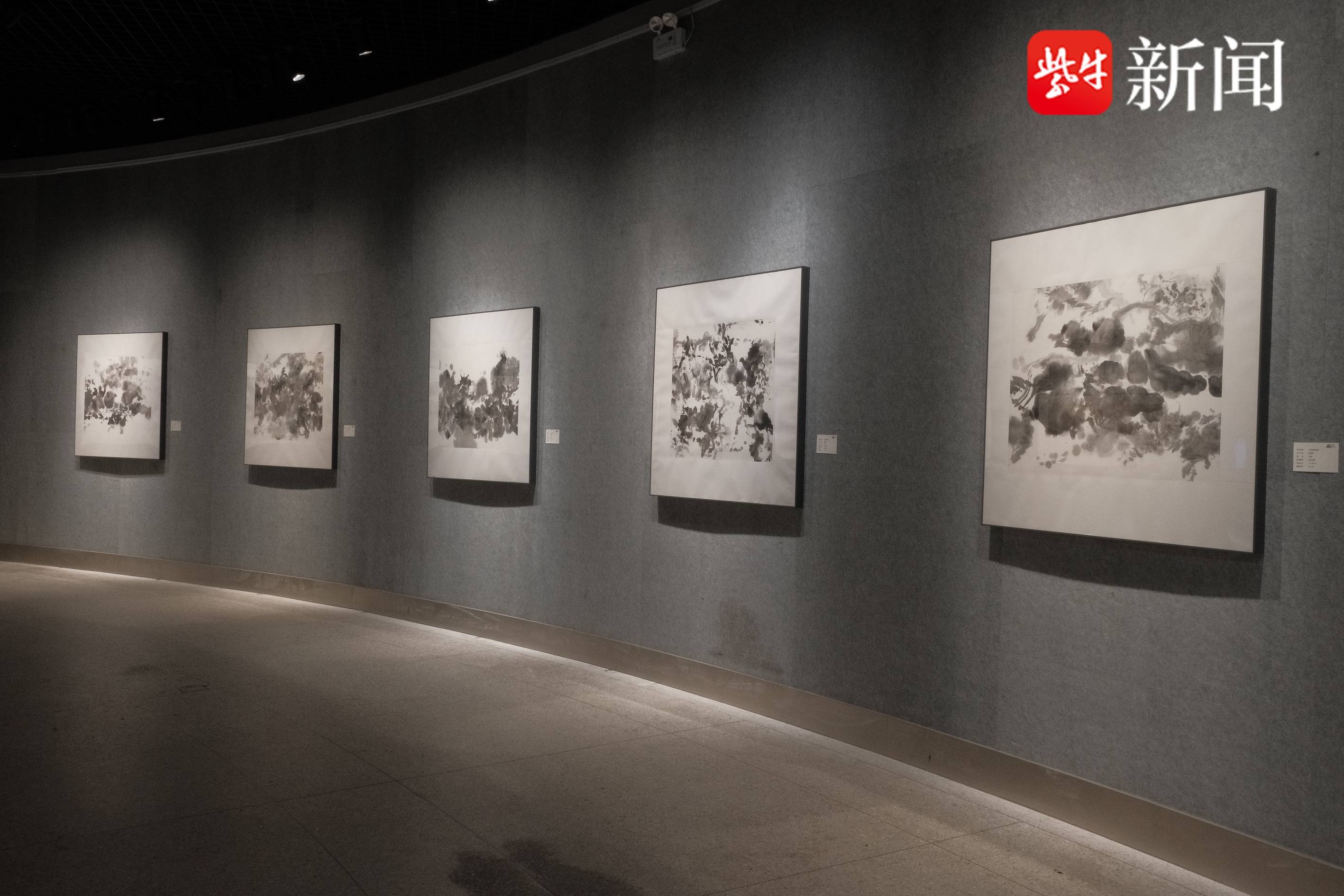 这次陈伟农带来了多幅悬书作品。他告诉记者,多年前在画水墨画时,随手一甩,墨水在纸上形成了独特的图形,突然有了灵感,便在泼墨的基础上,开创了悬书系列创作。