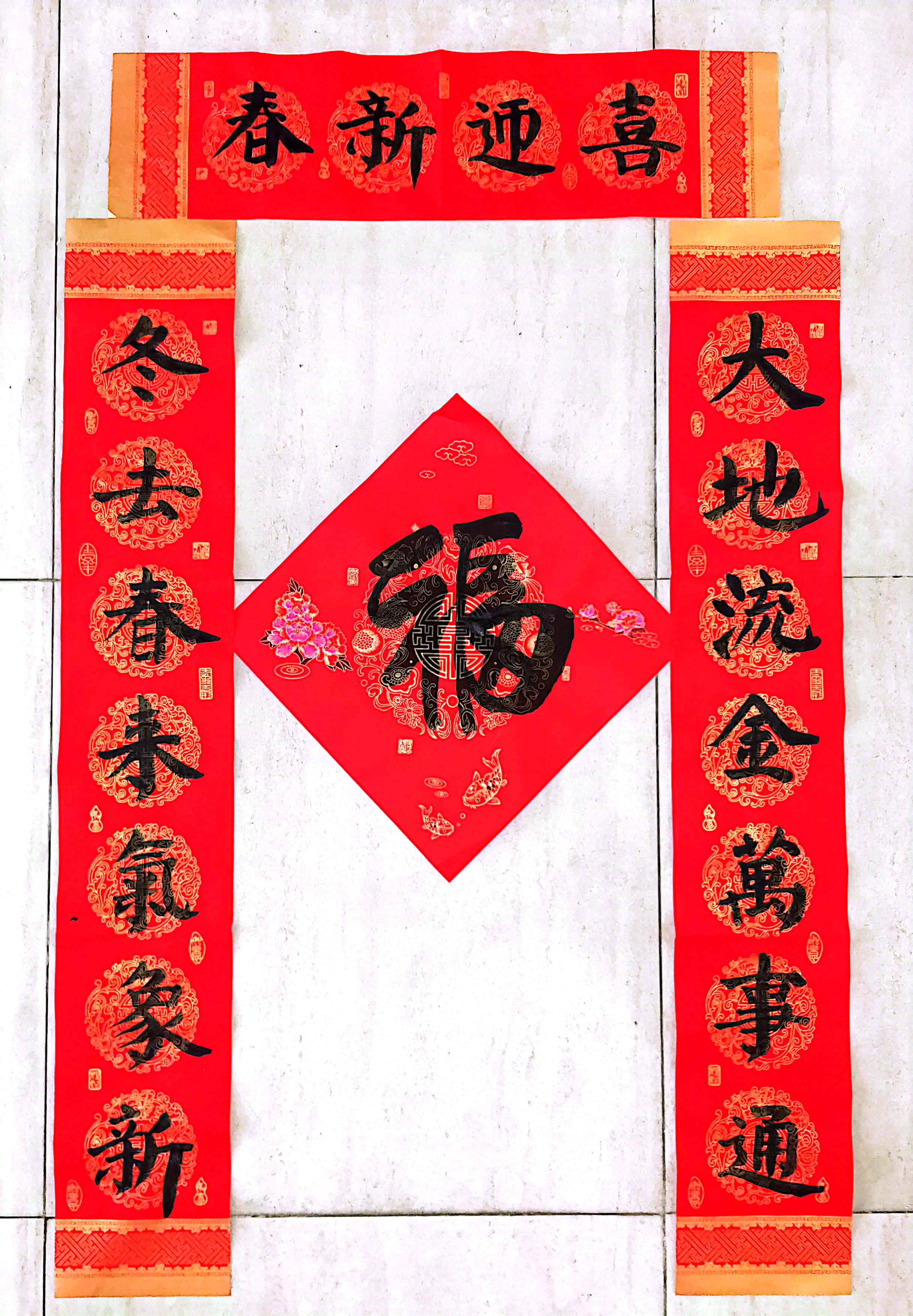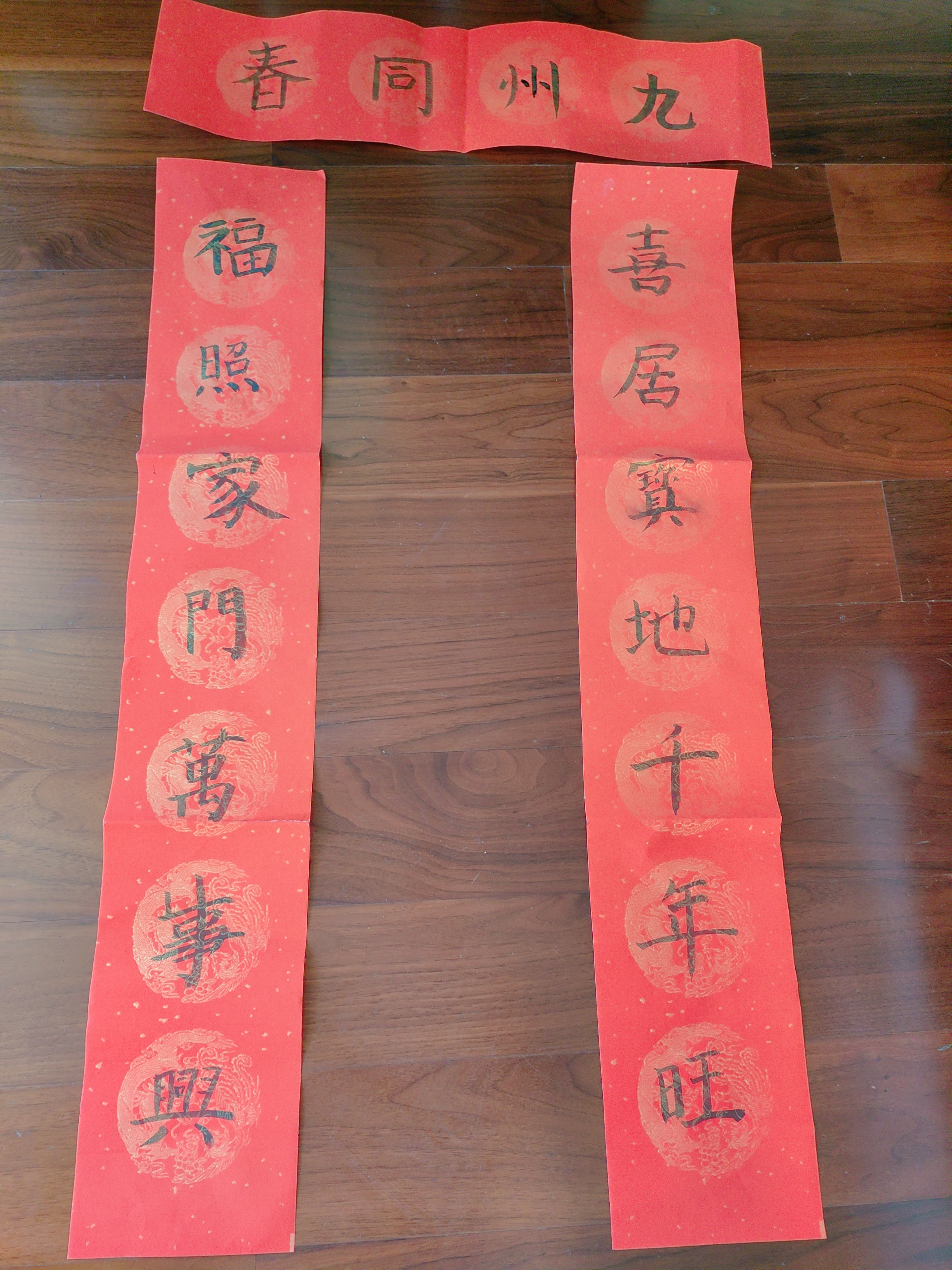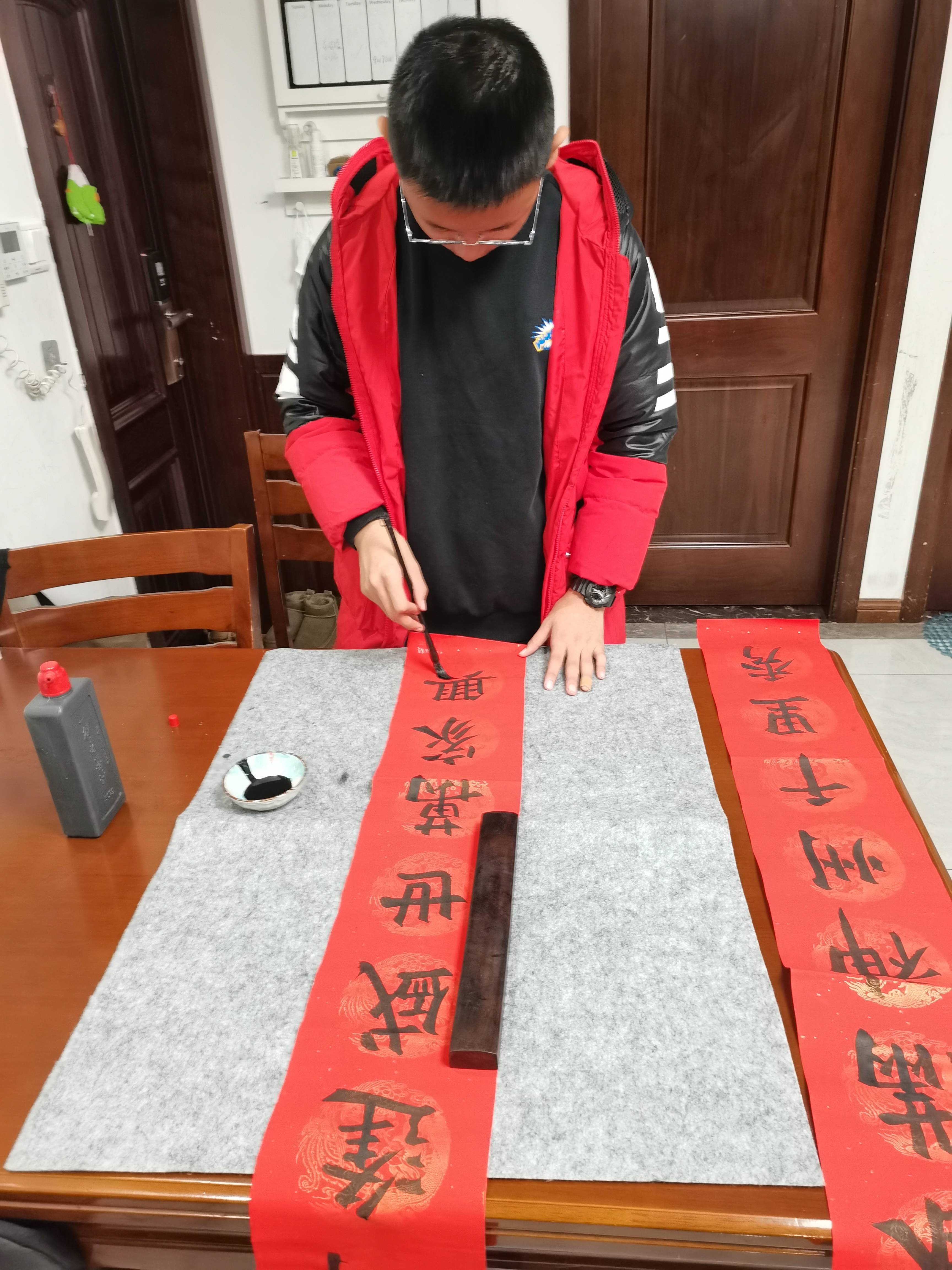 “喜居宝地千年旺 福照家门万事兴”这是苏州北大新世纪世恒学校初一(3)班朱米瑞同学的投稿作品,寓意家庭团圆和睦,招财进宝。朱米瑞的妈妈告诉扬子晚报/紫牛新闻记者,孩子已经学习软笔书法多年,并且已连续3年参加社区组织的写春联、送春联活动,现场书写春联送给社区的居民们,传递新春的祝福。“孩子对书法一直抱有很深的兴趣,得知扬子晚报第三届‘福娃’春联书写大赛开始了,他便第一时间报名参加了。这个比赛给孩子提供了一个展示作品的平台,也希望通过比赛增强孩子的自信心,鼓励孩子继续学习软笔书法。”