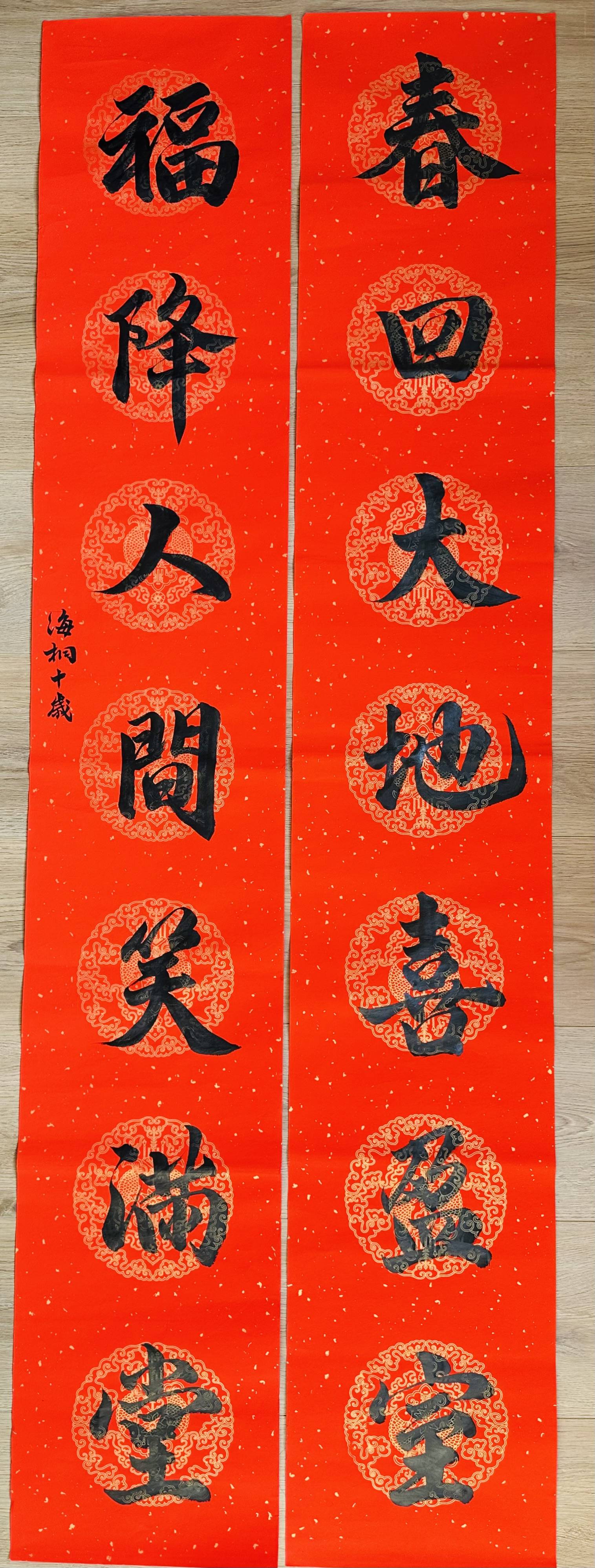 来自张家港市实验学校五(3)班的徐海桐,可是妈妈眼中的“小明星”,3年前开始学习软笔书法的她,曾连续两届获得张家港中小学书写大赛特等奖、苏州中小学生书写大赛一等奖。“春回大地喜盈室 福降人间笑满堂”这便是徐海桐的投稿作品。“这是孩子第二次参加扬子晚报‘福娃’春联书写大赛。我始终秉持着以赛促学、以赛促练的理念,通过鼓励孩子参加比赛,激发孩子的主动性,也让孩子坚定对爱好、技能的信心。”徐海桐的妈妈告诉记者,就在一个多月前,孩子还参加了学校组织的重阳节敬老志愿活动,她带上笔墨、红纸,亲手书写“福”“寿”字,送给敬老院内的爷爷奶奶们。“现场写书法会比在家里写更紧张一些,这对孩子也是一种能力的锻炼。希望孩子也可以参加这次春联大赛的年货市集、爱心义卖活动,将新春的祝福付诸笔端,为市民送上新春祝福!”徐海桐的妈妈说。