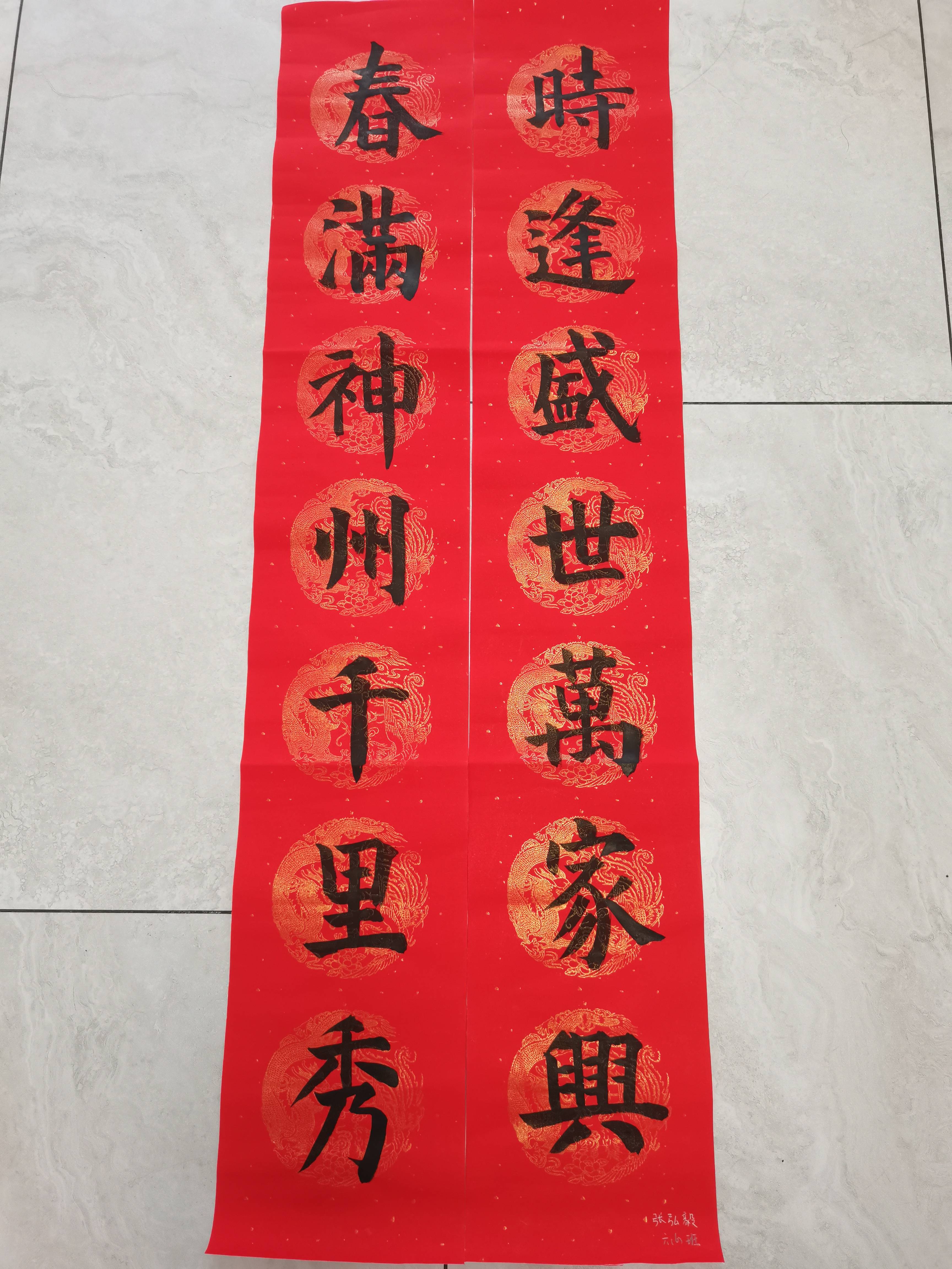 来自常熟市报慈小学六(6)班的张弘毅的投稿作品上写着“春满神州千里秀 时逢盛世万家兴”,寄托着他对祖国的美好祝愿和对生活的美好憧憬。张弘毅的妈妈告诉记者,孩子从2年前开始学习软笔书法,主要是为了让他消除浮躁情绪,静下心来。以书法养心,促进良好习惯的养成。没想到这孩子有些软笔书法的天赋,写得挺漂亮俊逸。现在几乎每个周末都会在家自觉“挤时间”练习,每次都至少一个小时。“孩子的舅舅特别喜欢他写的春联!去年春节前,舅舅特意登门向他‘讨’春联,贴在家门上。”