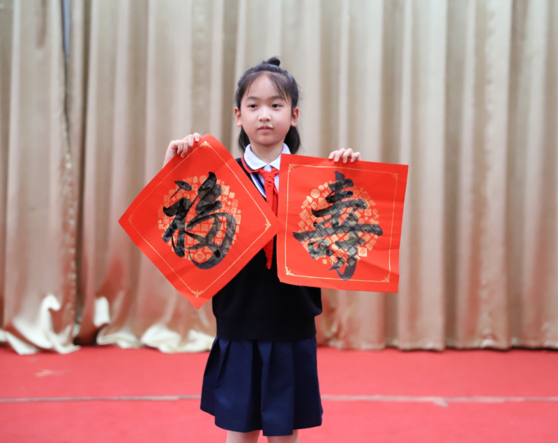 参与春联现场书写活动的小朋友可将自己现场书写的春联、福字进行义卖。