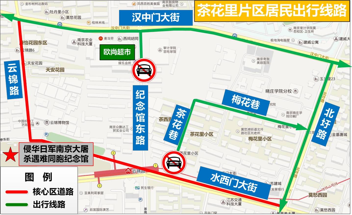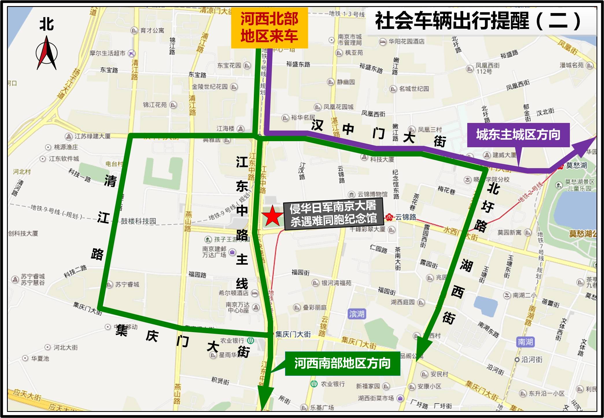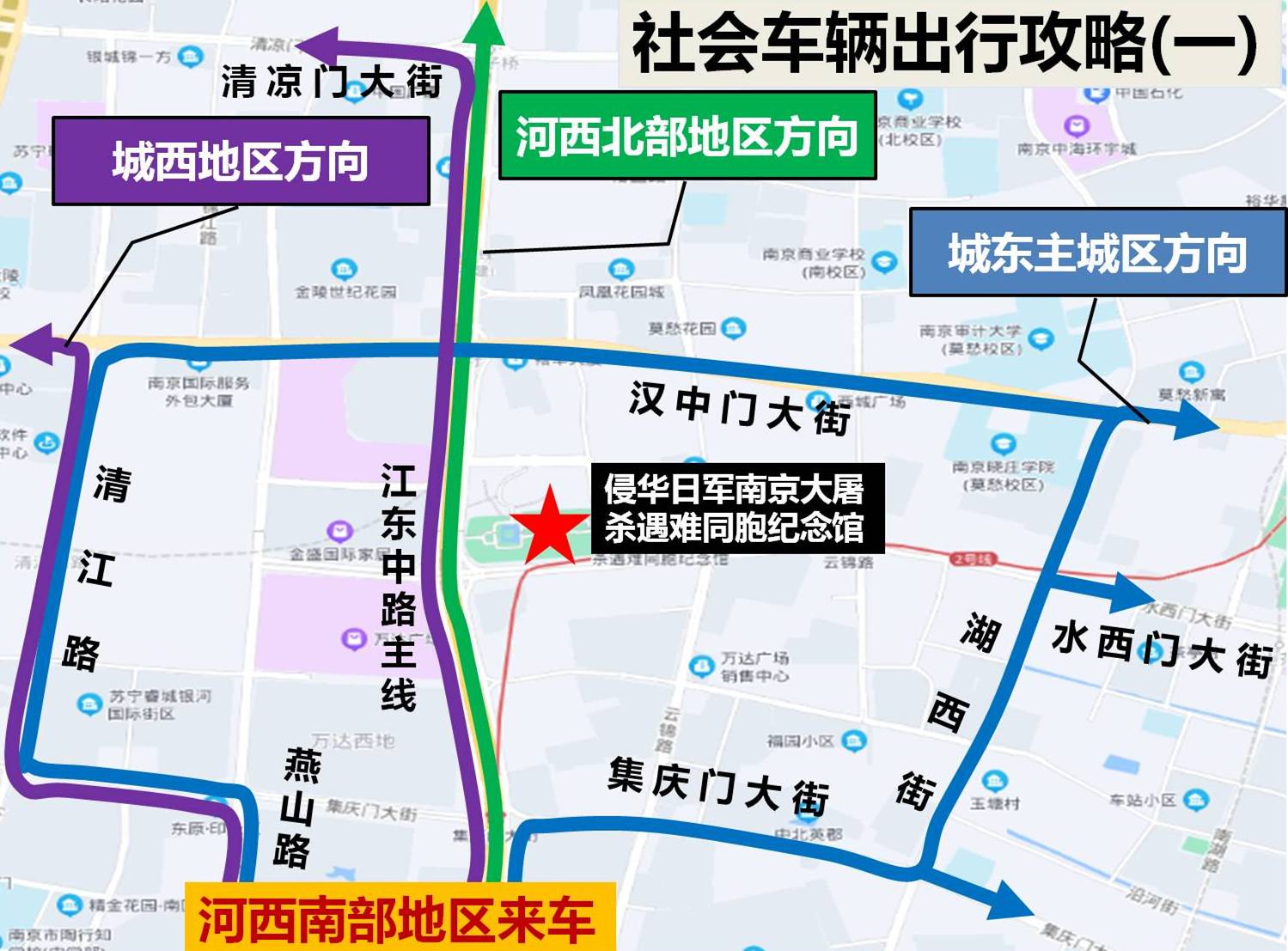 12月13日7时至13时,水西门大街(北圩路至燕山路段)、茶亭东街、云锦路(汉中门大街至茶亭东街段、水西门大街至福园街段)、江东中路地面辅道(汉中门大街至福园街段),除持有公祭仪式专用车证的车辆及执行紧急任务的警车、消防车、救护车、工程救险车外,禁止其他车辆通行。