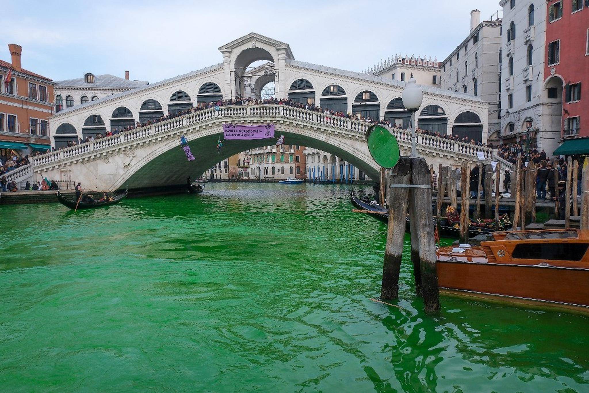 “反抗灭绝”(Extinction Rebellion)组织的抗议者表示,河水变为绿色是由一种无害的荧光素染料造成。几个小时后,这些水域就会恢复原样。不过,对于该组织抗议者的行径,意大利威尼斯市市长路易吉·布鲁尼亚罗谴责他们是“生态破坏者”,并呼吁意大利当局惩罚他们。
