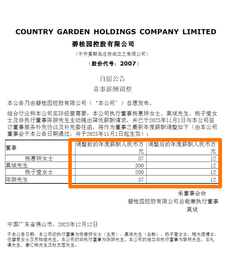 公告显示,杨惠妍为碧桂园现任董事局主席,莫斌则为集团总裁,他们二人调薪前的年薪分别为37万元和300万元。除了杨惠妍外,此番主动降薪的杨子莹及陈翀均为碧桂园创始人杨国强家族成员。杨子莹、陈翀调整前的年薪分别为200万元、37万元。