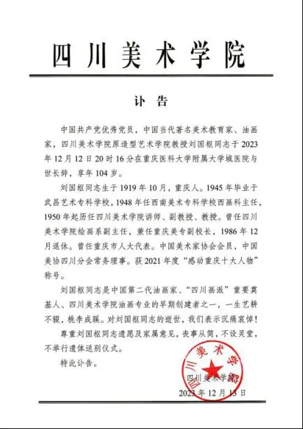 12月13日,四川美术学院发布讣告,中国当代著名美术教育家、油画家刘国枢于12月12日20时许在重庆逝世,享年104岁。
