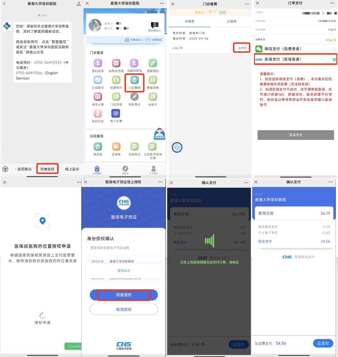 以香港大学深圳医院为例,参保人就医时,只需要通过医院微信公众号进入“智慧医院”中的诊疗服务,即可进行预约挂号,并通过授权医保电子凭证,直接线上通过医保支付挂号费用。缴费更无需到窗口排队,通过“门诊缴费”可一键结算。同时,医保门诊统筹基金报销、个人账户、个人自付费用等均可在微信公众号在线完成,全流程享受便捷就医服务。