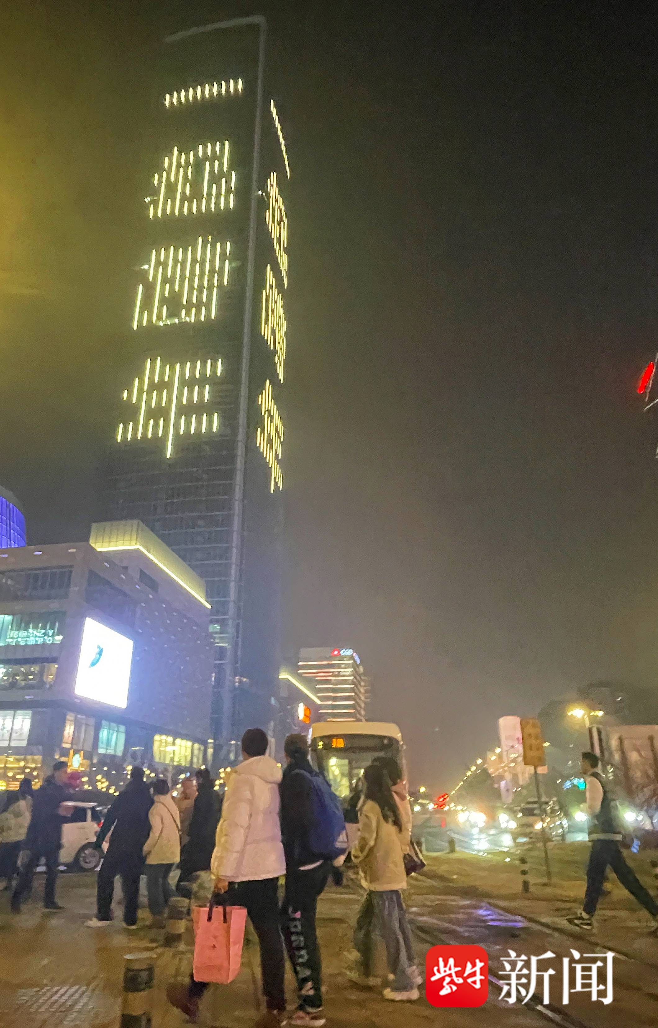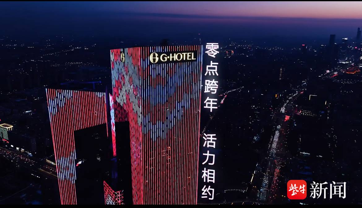 晚上11点55分,扬子晚报/紫牛新闻记者在河西金鹰世界看到,聚在这里迎接跨年倒计时的市民丝毫没有睡意。“10、9、8、7、6……”随着零点进入倒计时,368米塔楼楼体瞬间变身发光体,新年祝福语、炫酷灯光秀令人眼花缭乱、目不暇接,引得在场观众频频用手机拍摄。
