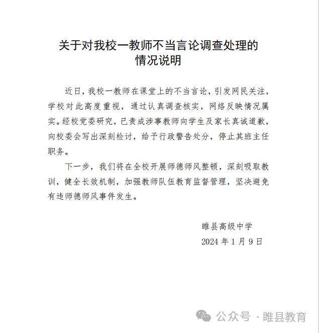 1月9日,河南睢县高级中学发布通报:近日,我校一教师在课堂上的不当言论,引发网民关注,学校对此高度重视,通过认真调查核实,网络反映情况属实。经校党委研究,已责成涉事教师向学生及家长真诚道歉,向校委会写出深刻检讨,给予行政警告处分,停止其班主任职务。