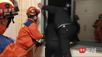 此时,派出所民警已经到场,站在阳台内部拉住了老人的脚,防止老人滑脱坠楼。了解情况后,消防员迅速分组进行救援,第一组消防员在楼下、楼上分别设置警戒区,疏散现场围观群众;第二组消防员携带安全绳和安全腰带迅速进入楼内,为窗口的民警和老人一并做好安全防护,防止坠落的风险,同时,楼下的消防员在底楼铺设好救生气垫。第三组消防员为高空救援组,利用登高平台消防车,升高至老人被困处,消防员协力将老人抬至登高车平台内,约10分钟左右,成功将老人安全转移至地面安全区域,并现场移交现场医护人员。