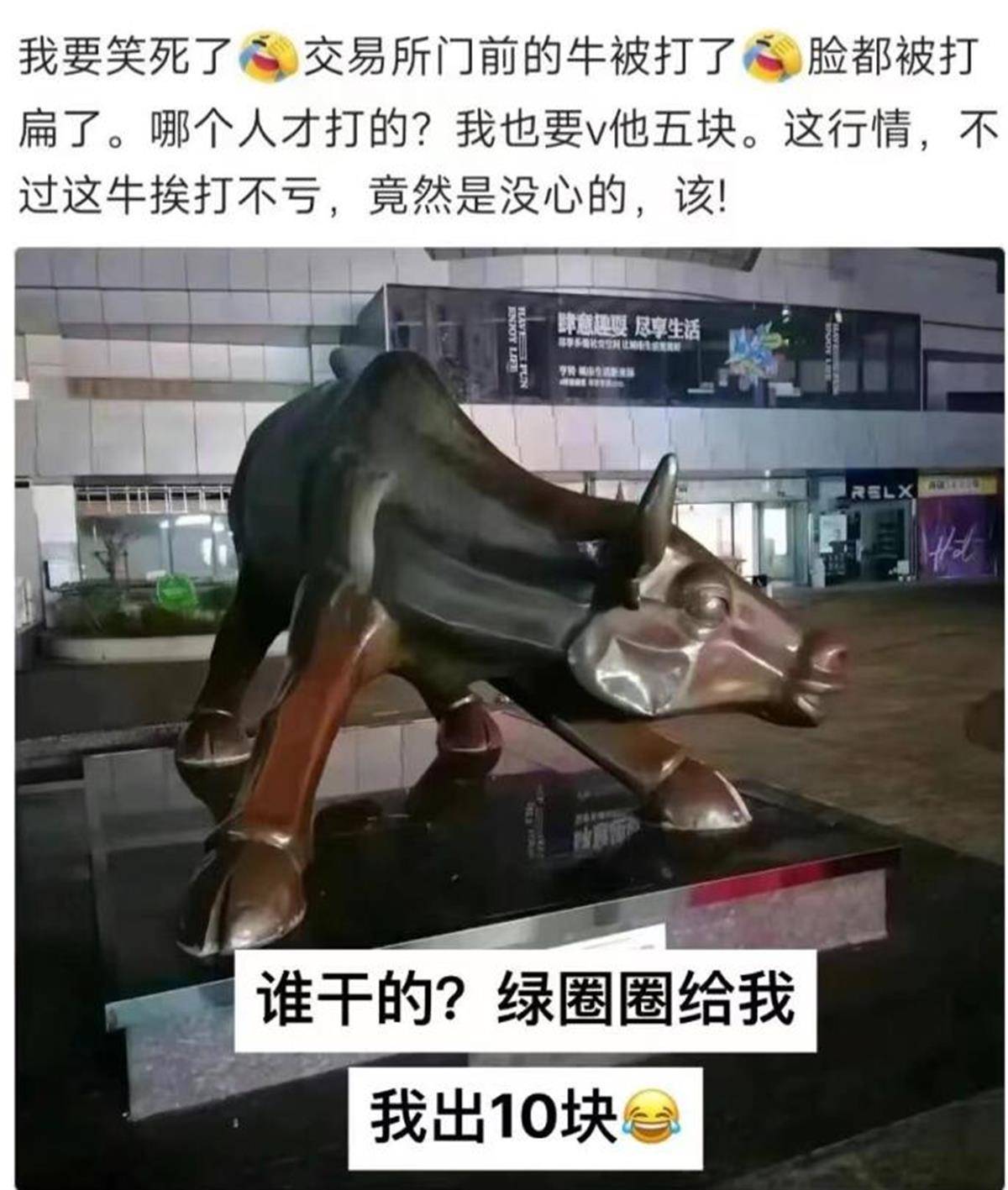 帖文中写道:交易所的牛被砸了?请别这么极端,冤有头债有主,牛何其无辜。牛被打脸、牛空心是熊市后期特征。