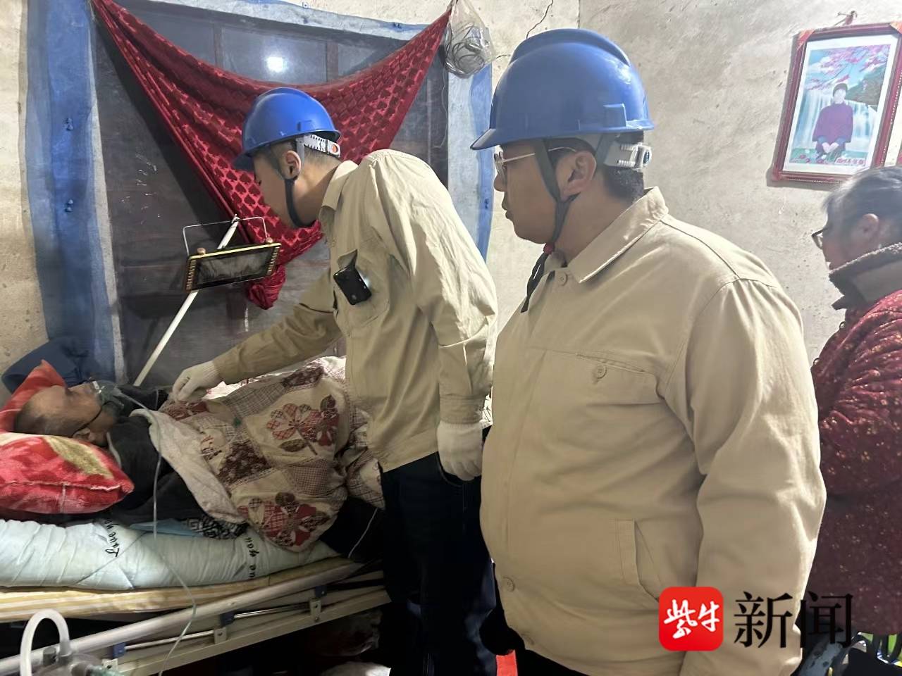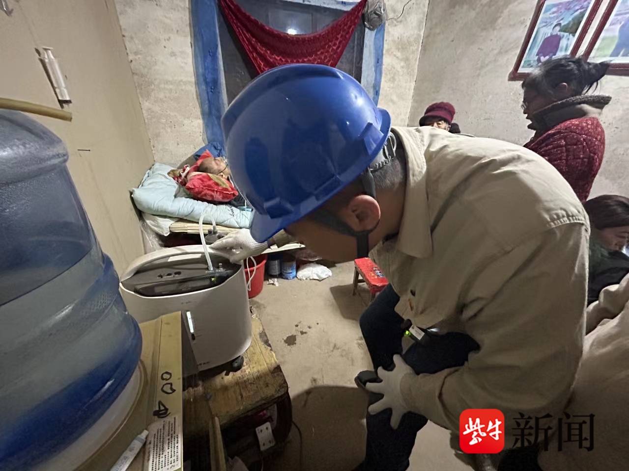 供电人员把老人制氧机连接上新能源汽车