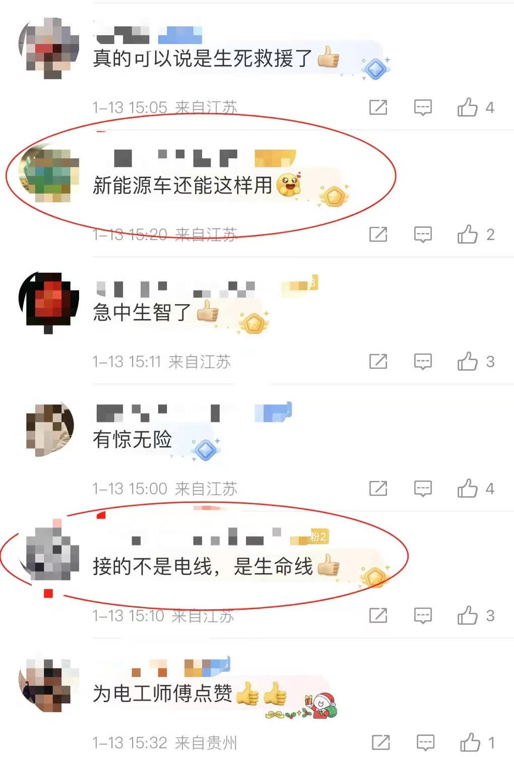 扬子晚报网1月14日讯(通讯员 王松竹 记者 高峰) 从1月13日晚开始,一条“电工打造临时充电桩 为断电老人供氧”的话题引起了很多网友的关注。因为一起意外事故,导致宿迁市沭阳县马厂镇部分区域临时断电,恰好有一名刚做完手术的老人需要24小时供氧。当地供电所的一名电工师傅急中生智,将自己的新能源车变成了一台移动充电桩,及时给老人续上了氧气。这段视频在部分社交平台发布后,许多网友赞道:“接的不是电线,而是‘生命线’。”