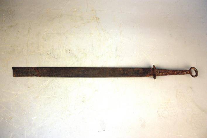 铁刀环首柄,桃形镡,刀尖背斜。刀脊近茎錾刻“两淮制置印侍郎任内咸淳六年造”14字。字迹清晰,刀刃锋利。据《宋史·地理志四》记载:“淮南路旧为一路,熙宁五年,分东西两路。”又据《宋史·本纪第四十六》载:“度宗咸淳六年,印应雷为两淮安抚制置使。”