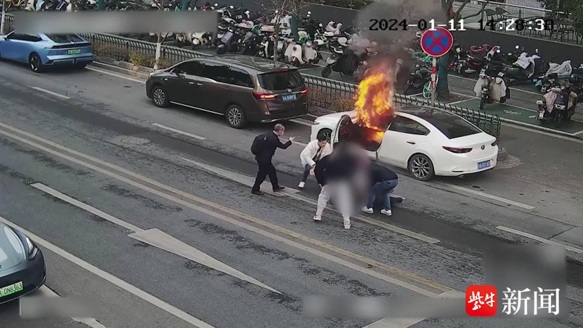 1月11日14时25分,一辆停放在建邺区某商场路边小轿车突然起火,黑色的浓烟不断从车内冒出,车辆随时有爆炸的可能。此时,驾驶员被安全带卡在座位上无法脱困,情况十分危急。上班路过的陈竹听到呼救声,第一时间冲了上去,双闸街道工作人员李有武听到呼喊也紧随其后,上前帮忙。当时副驾驶位置火势迅速蔓延,已经烧到主驾驶位,陈竹一把拽住驾驶员的腿往外拉。浓烟熏得人睁不开眼、喘不过气,虽然几次摔倒在地,但陈竹始终没有放弃,继续奋力拖拽。李有武探头到车内尝试扯断安全带,两人合力终于顺利将驾驶员解救出来。受困驾驶员撤离的同时,整个车身就完全被火焰覆盖。经医护人员检查,驾驶员的背部、右边手臂、右脸有不同程度烧伤,因救援及时并无生命危险。