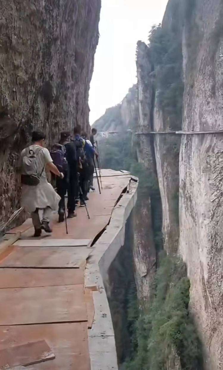 网友行走在没有护栏的栈道上。