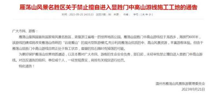记者在雁荡山风景旅游管理委员会官网看到,2023年9月21日,雁荡山管委会曾发布《雁荡山风景名胜区关于禁止擅自进入显胜门中高山游线施工工地的通告》:雁荡山是我国首批国家级风景名胜区,更是浙江省唯一的世界地质公园。雁荡山显胜门中高山游线位于龙西乡,海拔约600米,该游线的建成将改变雁荡山传统的“谷底看山”的观光型旅游模式,充分利用雁荡山优质的中、高山风景资源,丰富游客体验。但由于雁荡山显胜门中高山游线目前正处于施工状态,崖壁的危石随时有掉落的可能。为更好保护雁荡山世界地质遗迹,以及本着对广大市民、游客的生命安全负责,即日起,未经审批禁止擅自进入显胜门中高山游线。对违反通告的组织、单位或个人,一经发现查实,将按有关规定进行处罚。