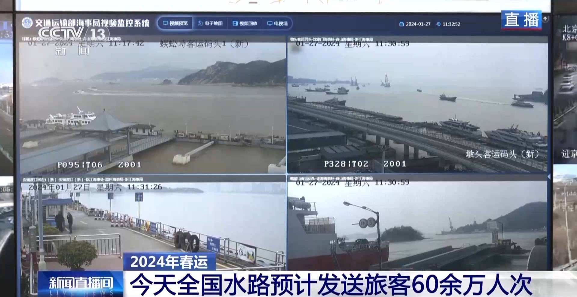总台央视记者 唐颖:今天全国水路预计发送旅客60余万人次。从浙江海事部门了解到,昨天浙江全省水上进出港旅客超过11万人次,其中舟山蜈蚣峙客运码头预计春节8天水上发送旅客将达到100万人次左右,同比将增加33%。