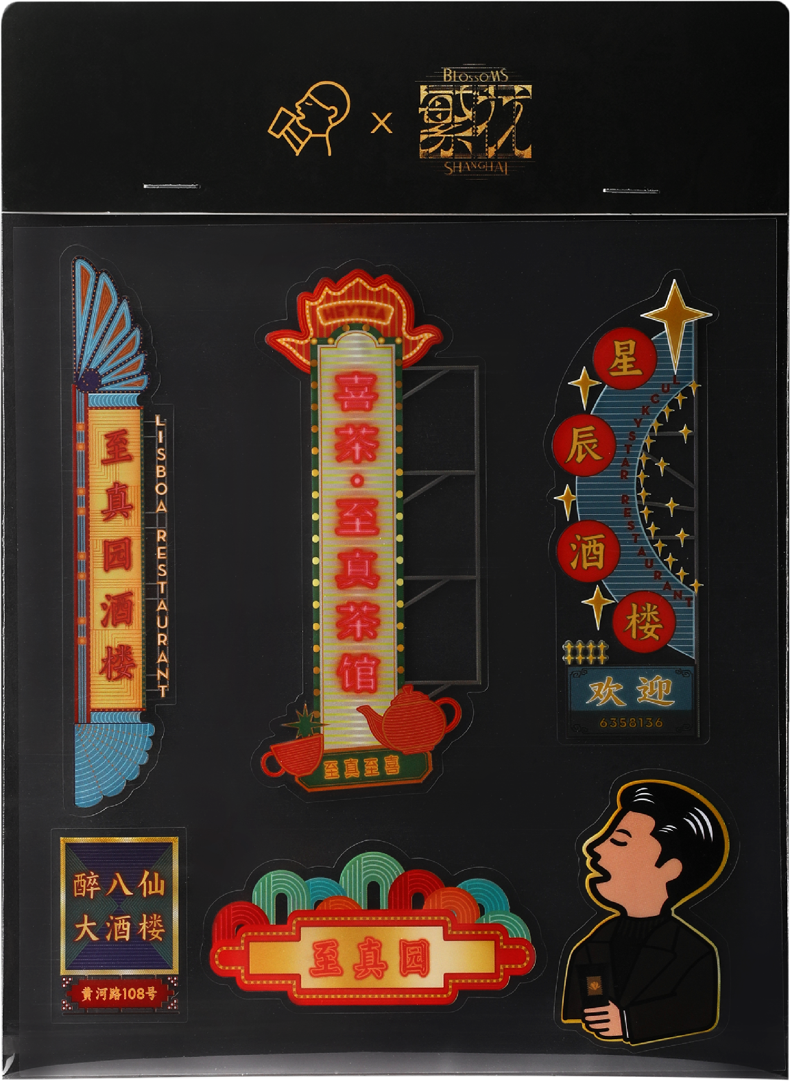 而联名贴纸周边则把目光放在了《繁花》剧集中最令人印象深刻的故事场景——黄河路上。剧中的黄河路酒楼饭店林立,入夜后灯火煌煌,各路人物走马灯般上演种种情节。通过在黄河路上展开的众多故事场景,王家卫导演独特的视觉风格、对光影的理解和把握均表现得淋漓尽致。喜茶选取黄河路上的各色店家灯牌,结合剧中美术原型进行贴纸形象的创作设计。如喜茶·至真茶馆灯牌贴纸,是以金美林酒楼为原型,顶部融入白玉兰花元素,搭配代表喜茶的茶碗、茶壶共同创作。而茶馆也是上海城市文化的重要载体之一。至真园酒楼灯牌、霓虹灯贴纸,则是参考剧中的“至真园”进行颜色重新定制后的呈现效果。