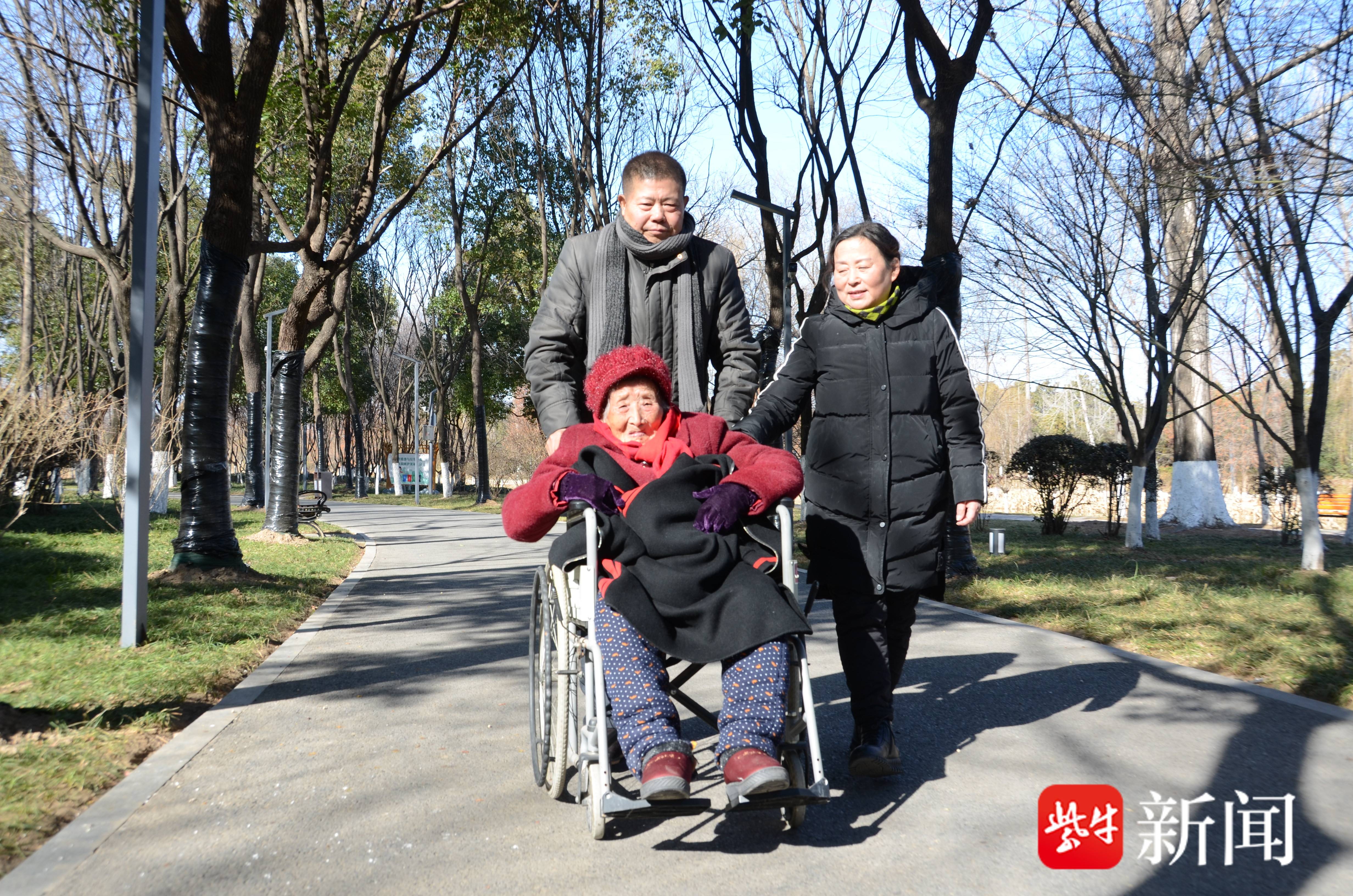 唐翠林与爱人孙以祥推着老母亲在公园散步