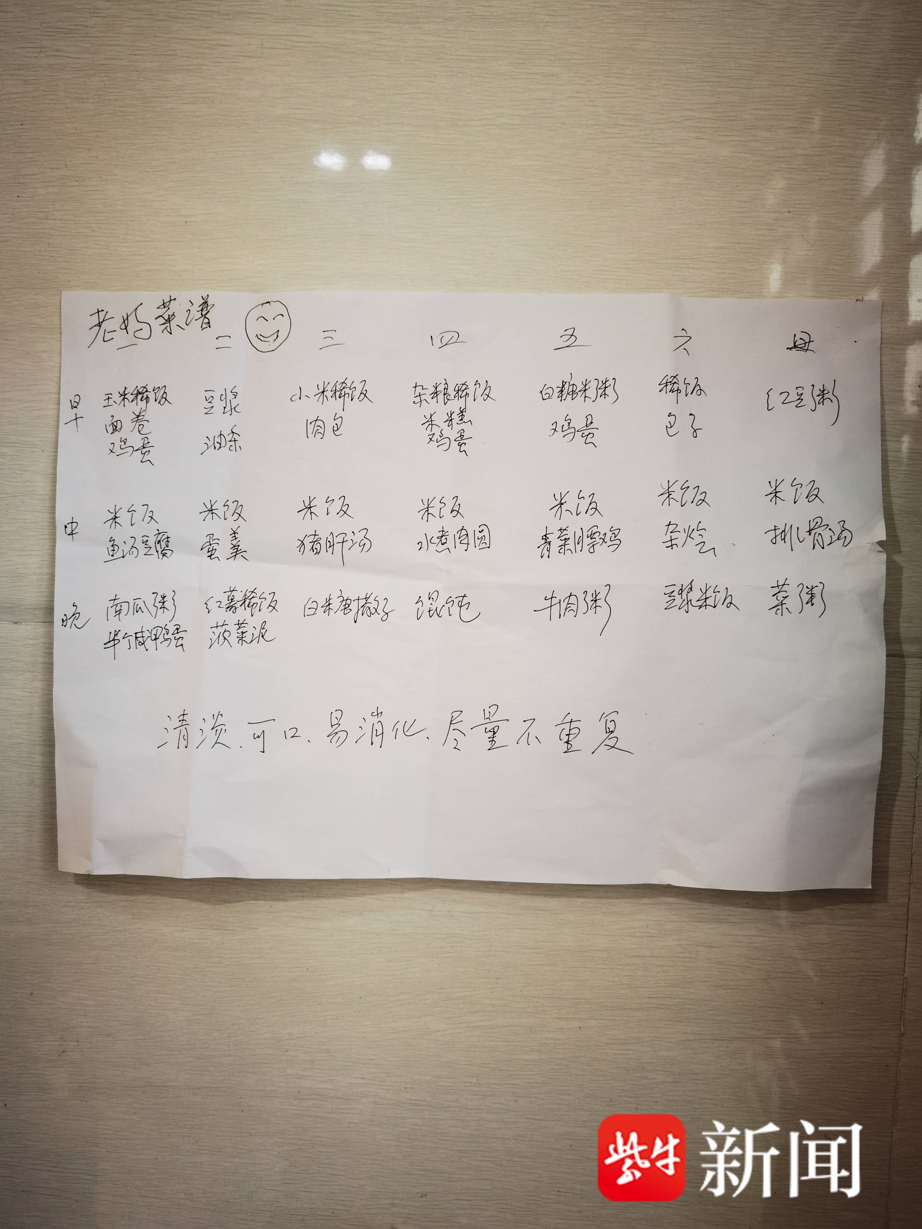 “留住妈妈的心,先要想法留住妈妈的胃。”猜透了妈妈的心思,唐翠林走到哪,就买哪儿的特色小吃给母亲尝。她还在一日三餐上翻新花样,只要妈妈喜欢的,她都想尽办法“安排”。在唐翠林家厨房,贴着一张夫妻俩精心为颜苏华定制的“老妈菜谱”。菜谱上写着:周一:鱼汤豆腐;周二,豆浆、蛋羹;周三,肉包、猪肝汤;周四,水煮肉圆;周五,青菜膘鸡;周六,小磨稀饭;周日,红豆粥、排骨汤。此外,鸡蛋、熬粥、葡萄、香蕉、石榴、苹果,更是颜苏华日常生活的“标配”。