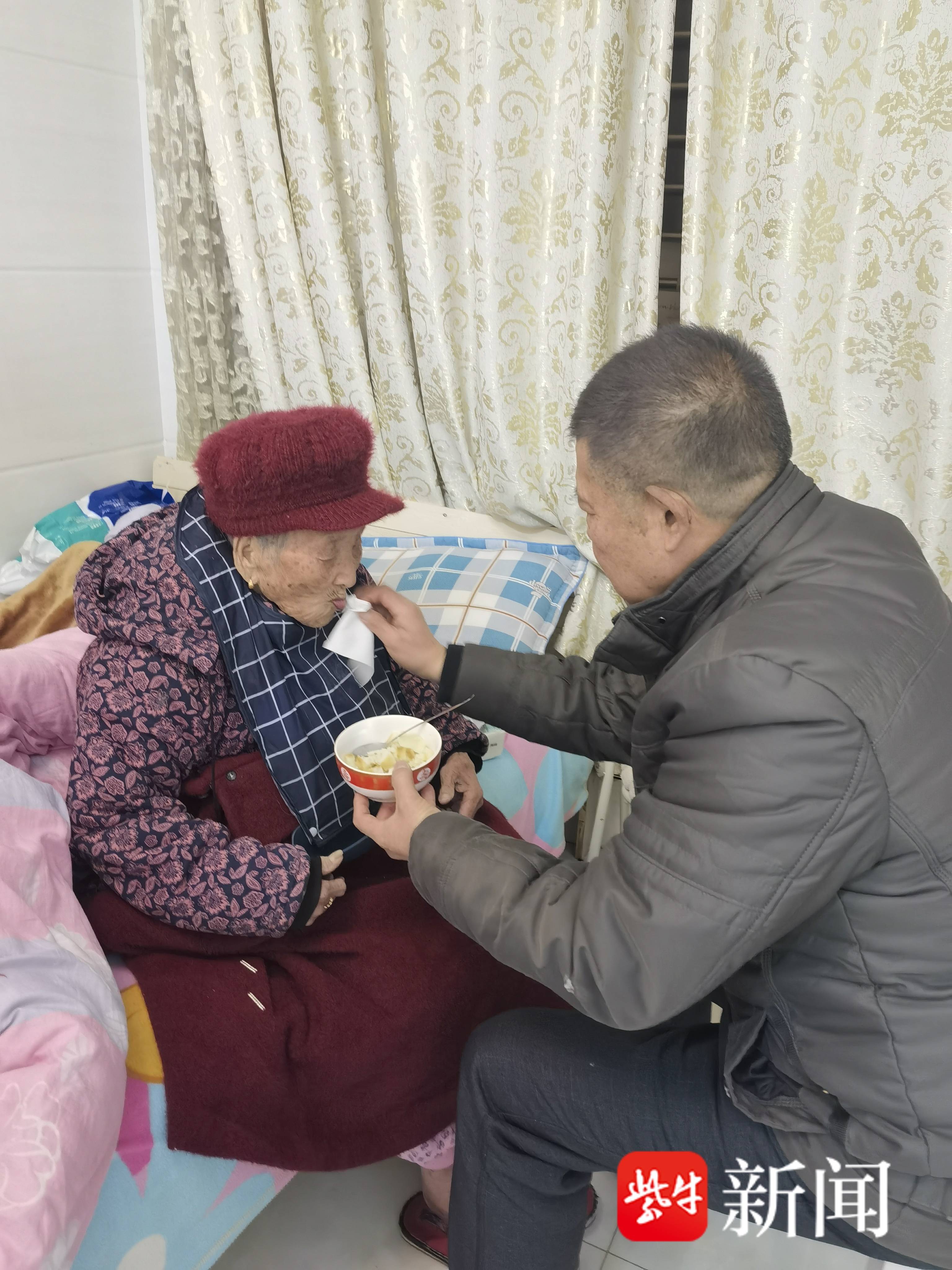 “伤筋动骨一百天。”对于92岁的老人,康复需要更长的时间。孙以祥、唐翠林用行动证明了“久病床前有孝子”。唐翠林说,为防止卧床的母亲长褥疮和便秘,每天要给她翻身六七次,给压红的皮肤涂软膏;母亲吃饭喝水容易呛着,他们就用管子小心翼翼地喂。清理大小便,是最难的,但他们不嫌不弃,毫无怨言。