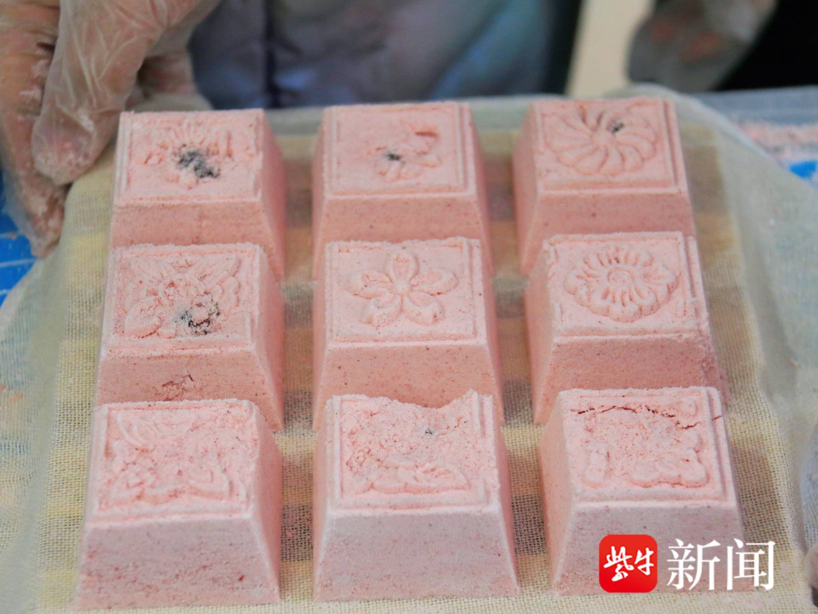 上过“节日课”后,团队成员便开始制作此次的年蒸——小圆松糕和糯米团子。年蒸是扬州的传统习俗,寓意来年“蒸蒸日上”。大学生们将大米粉、糯米粉、白糖、红曲粉和水搅拌均匀,置于筛中,筛出细腻的粉粒,将筛好的粉粒放入模具填平压实,脱模后蒸制。蒸熟后,软糯香甜、色泽粉红的小圆松糕就制作完成了。糯米团子圆滚滚、软乎乎,成员们和小朋友们一起动手,将大米粉、糯米粉及白糖用温水调制成面团后,取下剂子,将剂子放在掌心搓成团,捏成窝形后放入事先调制好的馅心,拢圆成型。最后,将成型的团子均匀地沾上蒸熟的糯米,放入笼中蒸制成熟。