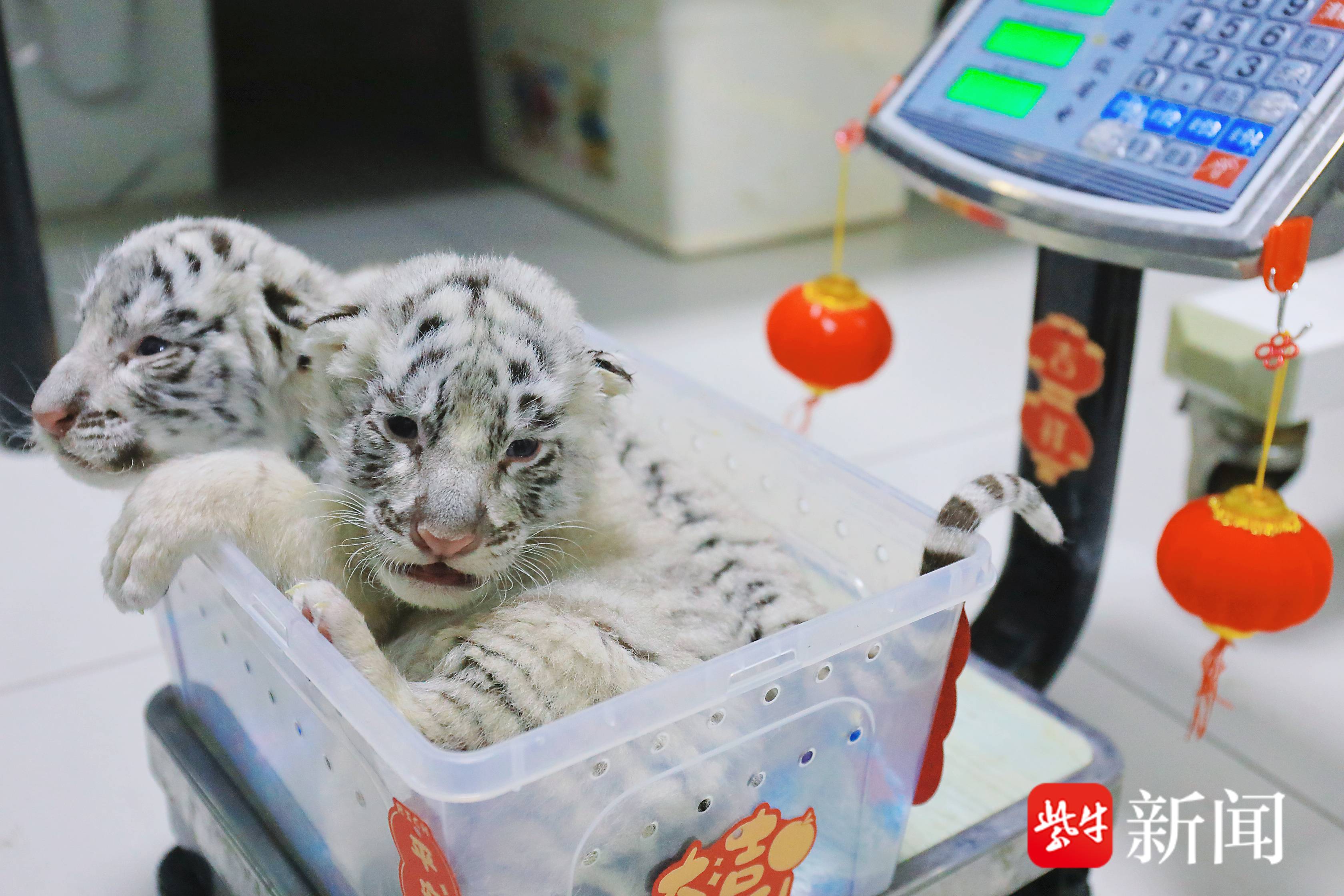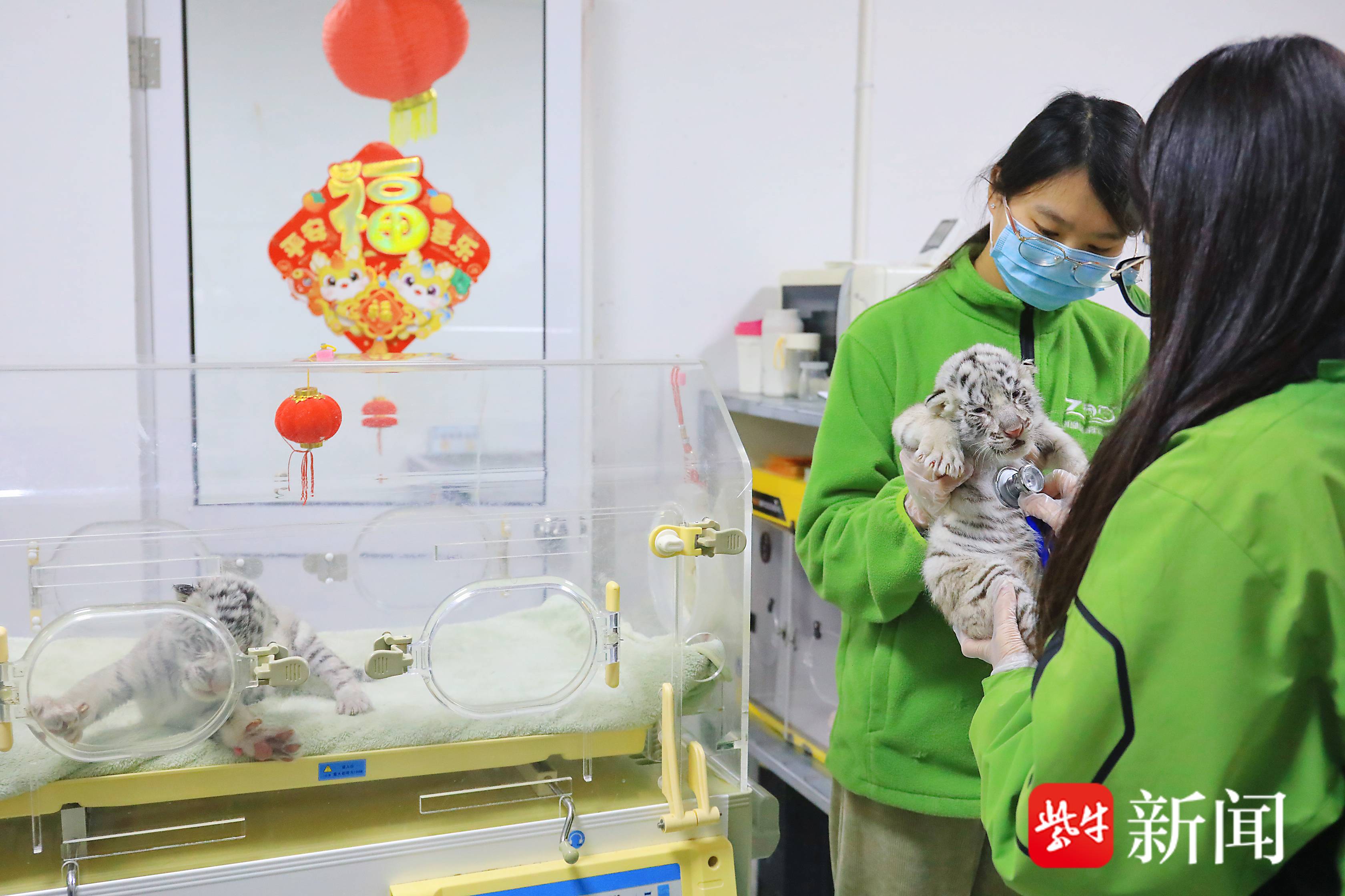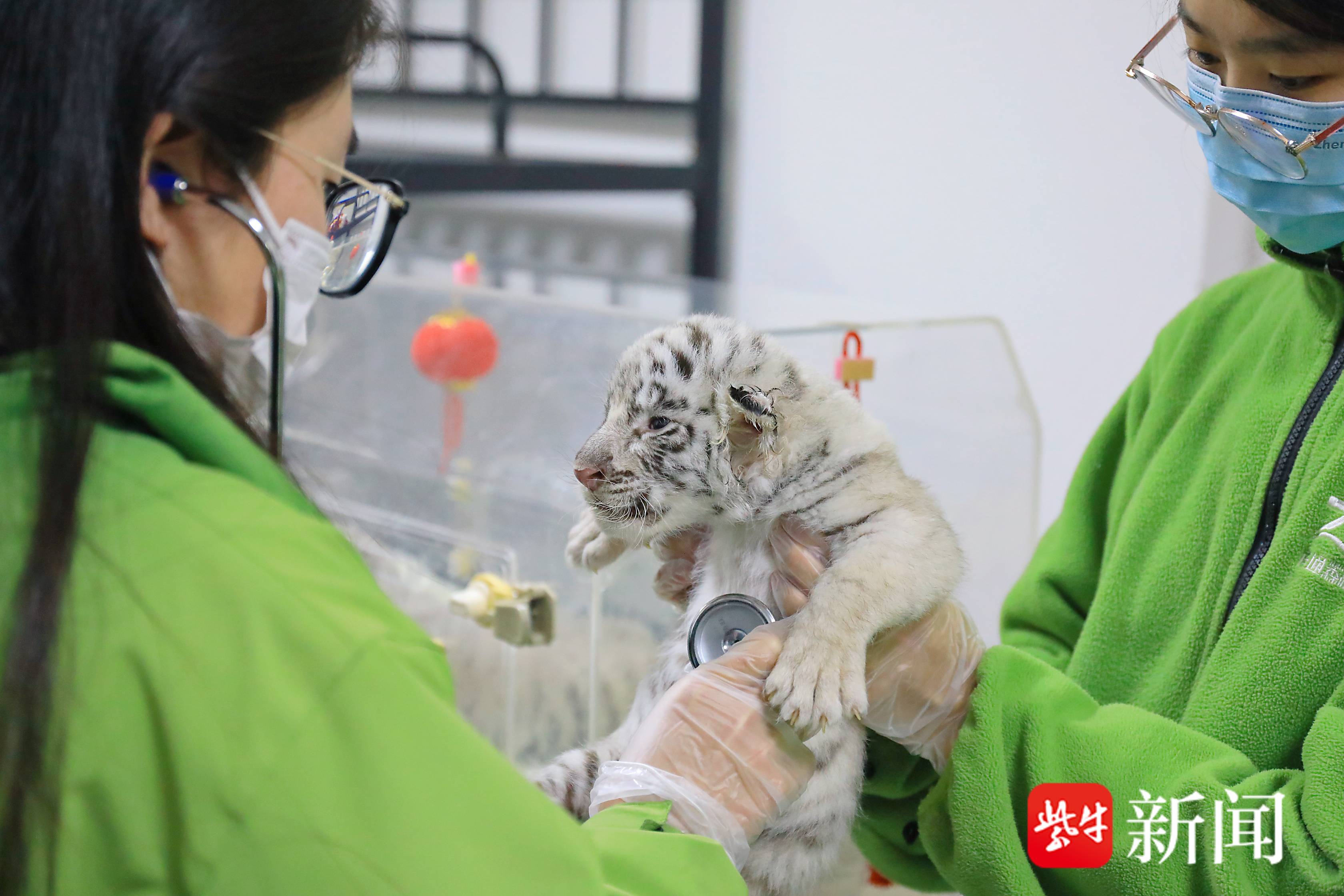 2月5日下午,南通森林野生动物园刚出生一周的白虎双胞胎,迎来了集体体检的一天。