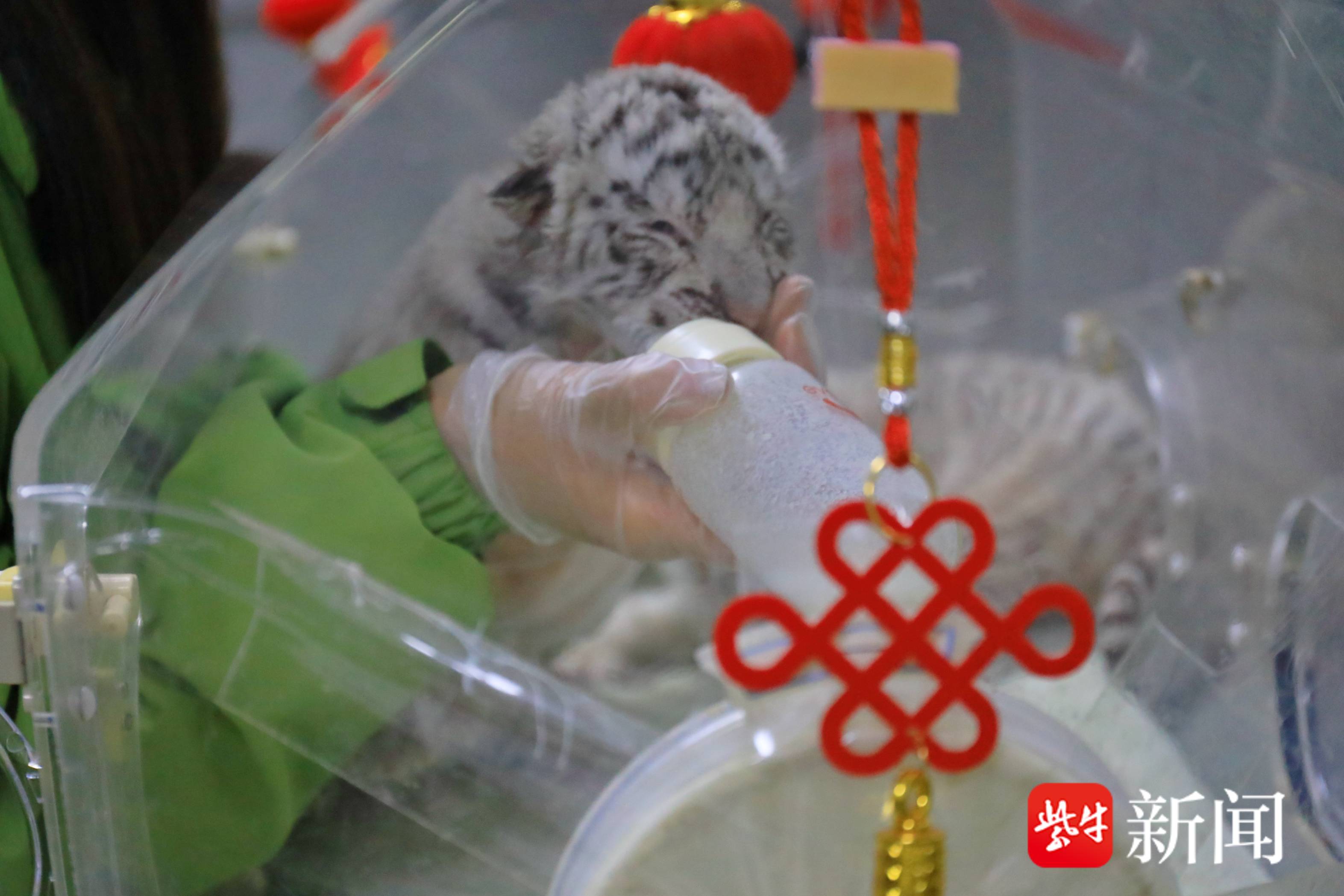 到了喂奶的时间,奶妈们给奶瓶高温消毒之后就熟练地泡好奶粉送到白虎的嘴边,托着小脑袋细心地给它们喝着,喝完之后轻轻的拍奶嗝然后揉揉小肚子促进消化帮助排便。