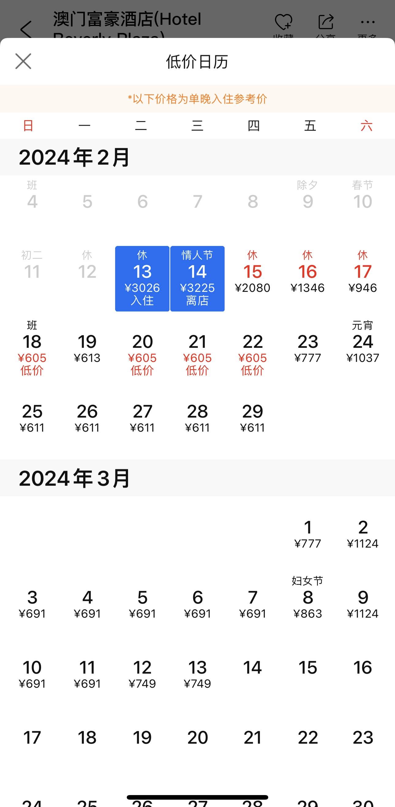 以大三巴牌坊附近为例,距其步行1公里左右的澳门富豪酒店2月13日入住的最低价格为3026元;2月14日入住的最低价格为3225元。而春节假期过后的一周,最低入住价格仅605元,2月14日入住的最低价格为2月最低入住价格的5.33倍。