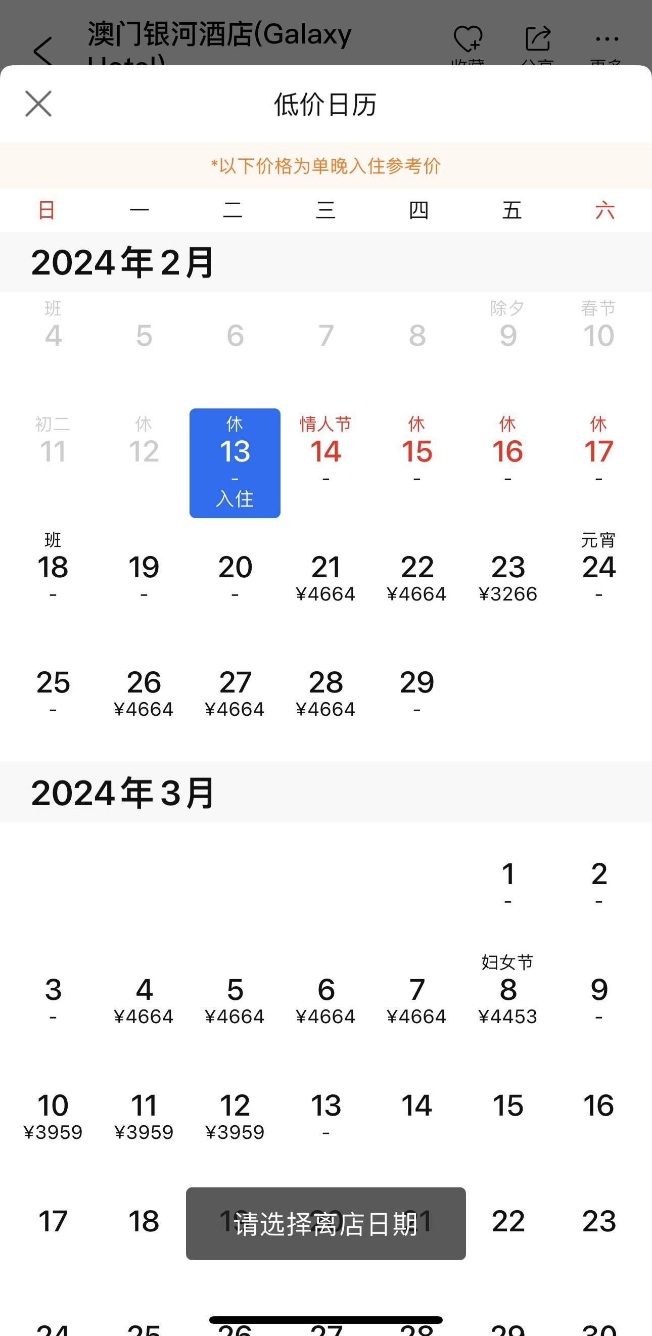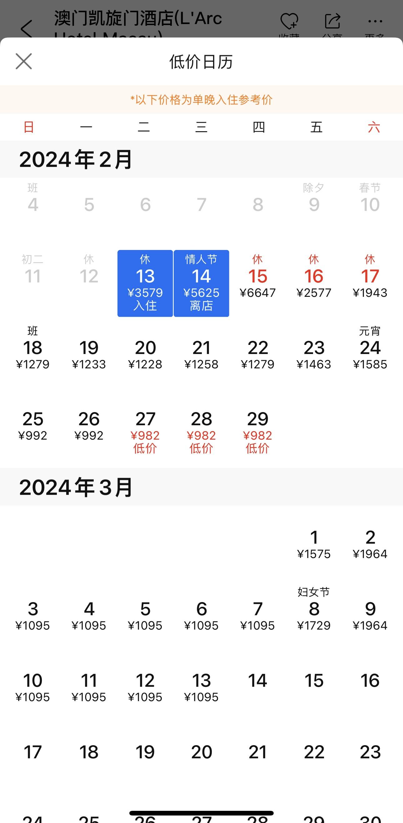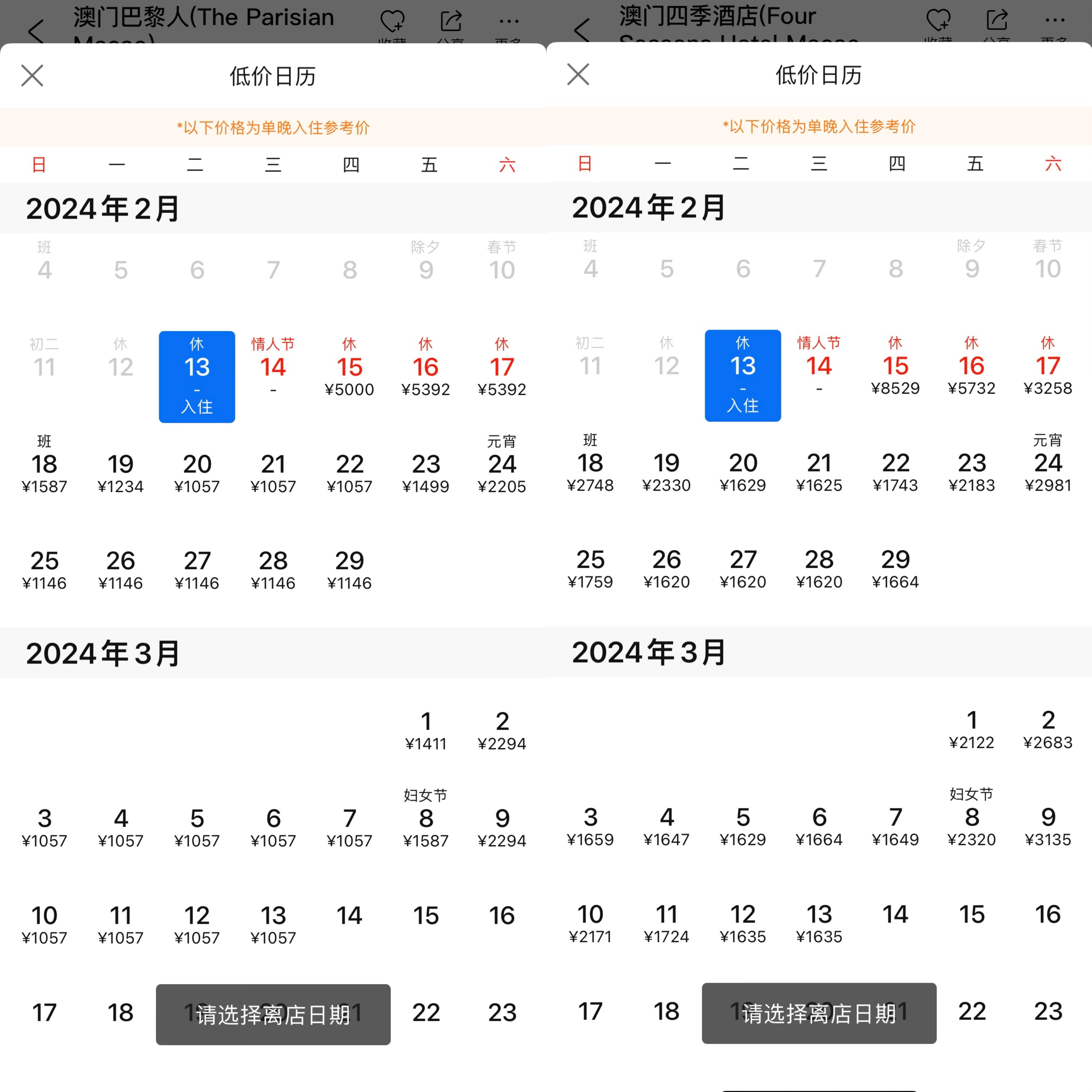 澳门巴黎人和澳门四季酒店2月13日、14日入住的客房都已售罄。
